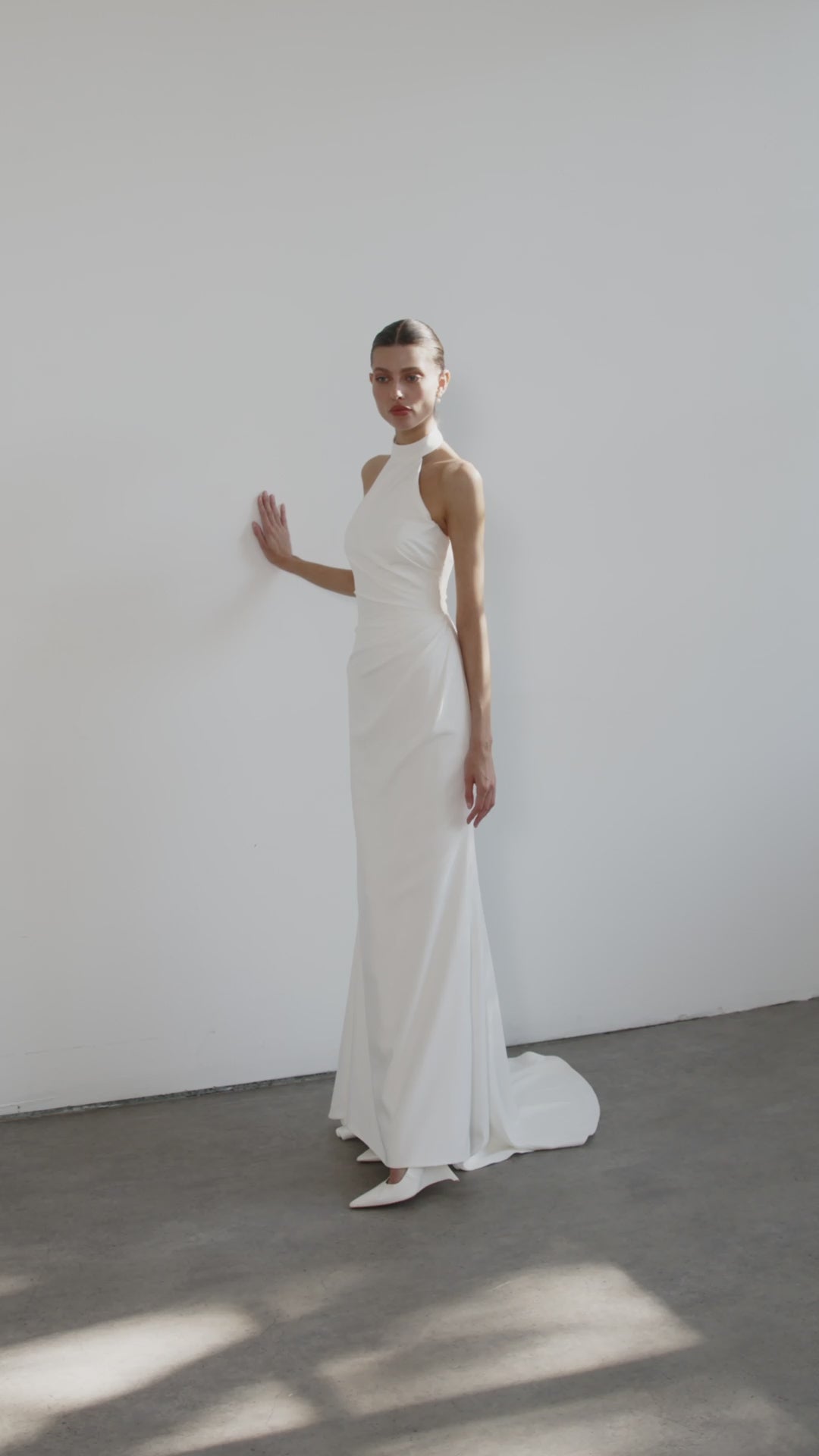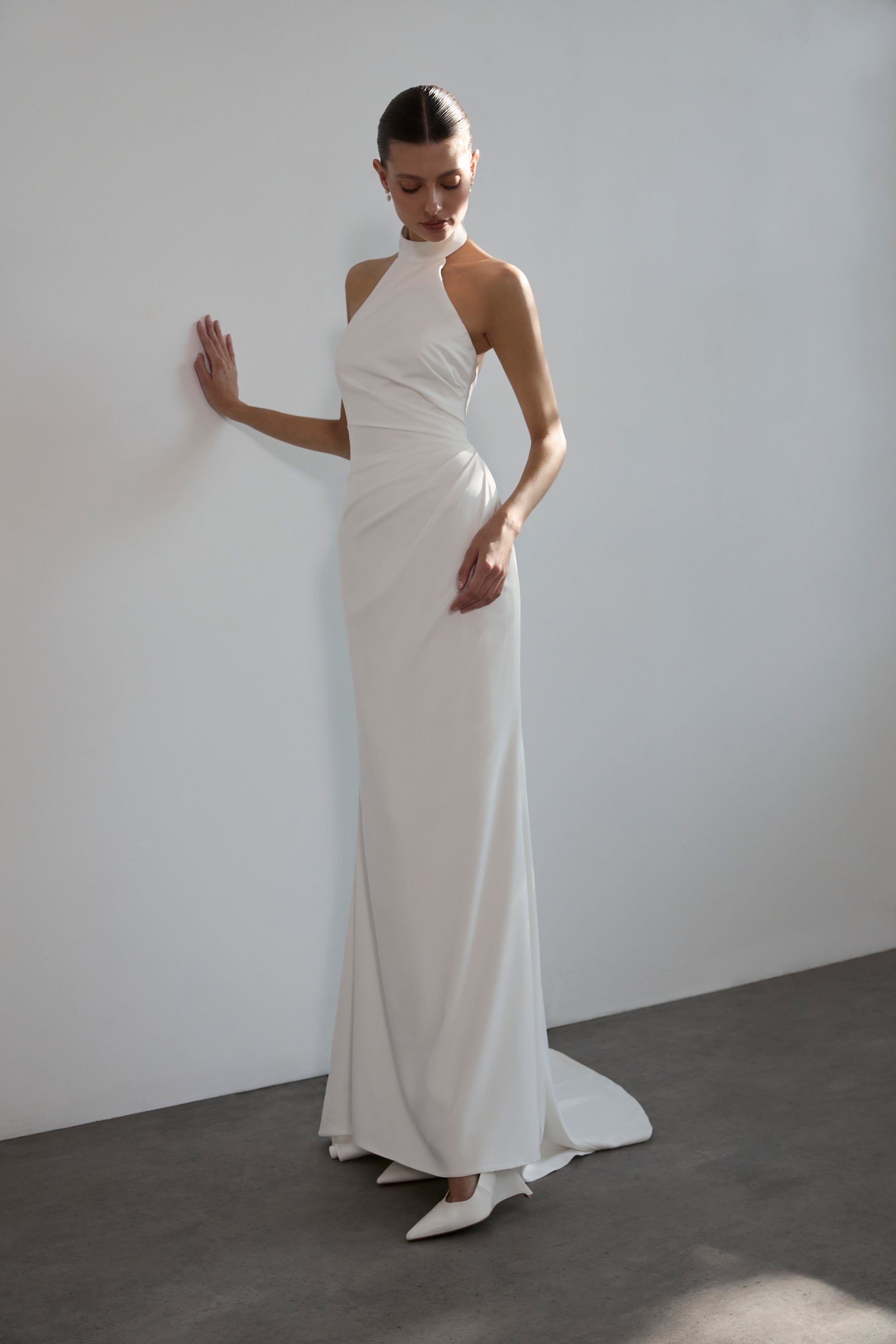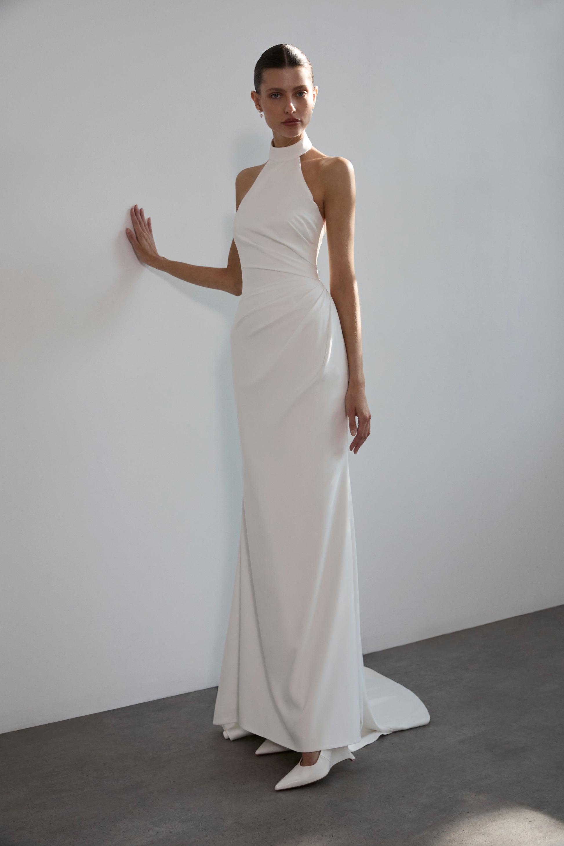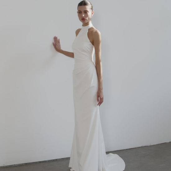 Carly is a high-neck halter gown in matte satin with a mermaid silhouette. Pleated tailoring at the waist lends sculptural detail, while an open back adds allure. A detachable bow introduces a ceremonial accent, balancing modern simplicity with timeless refinement.