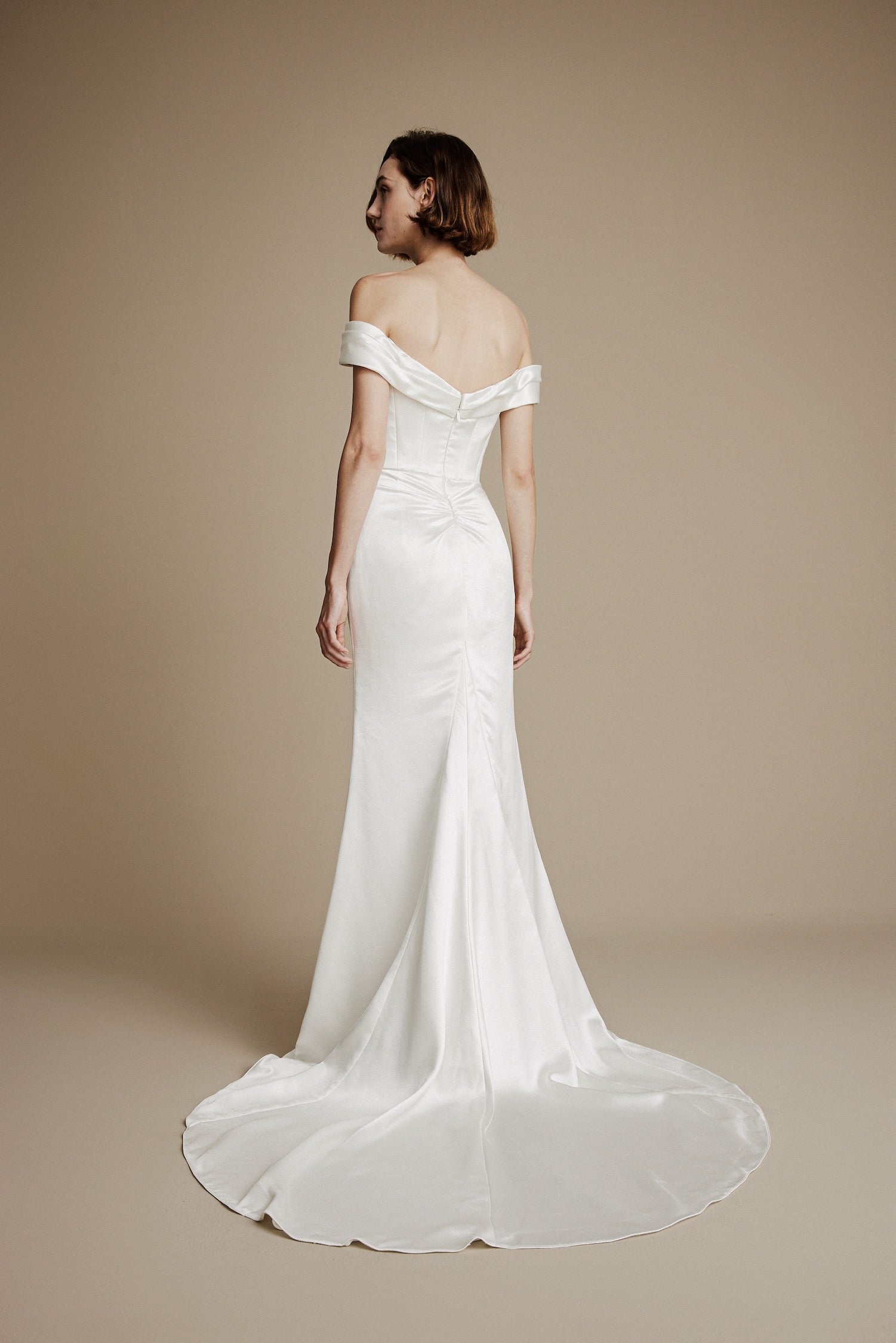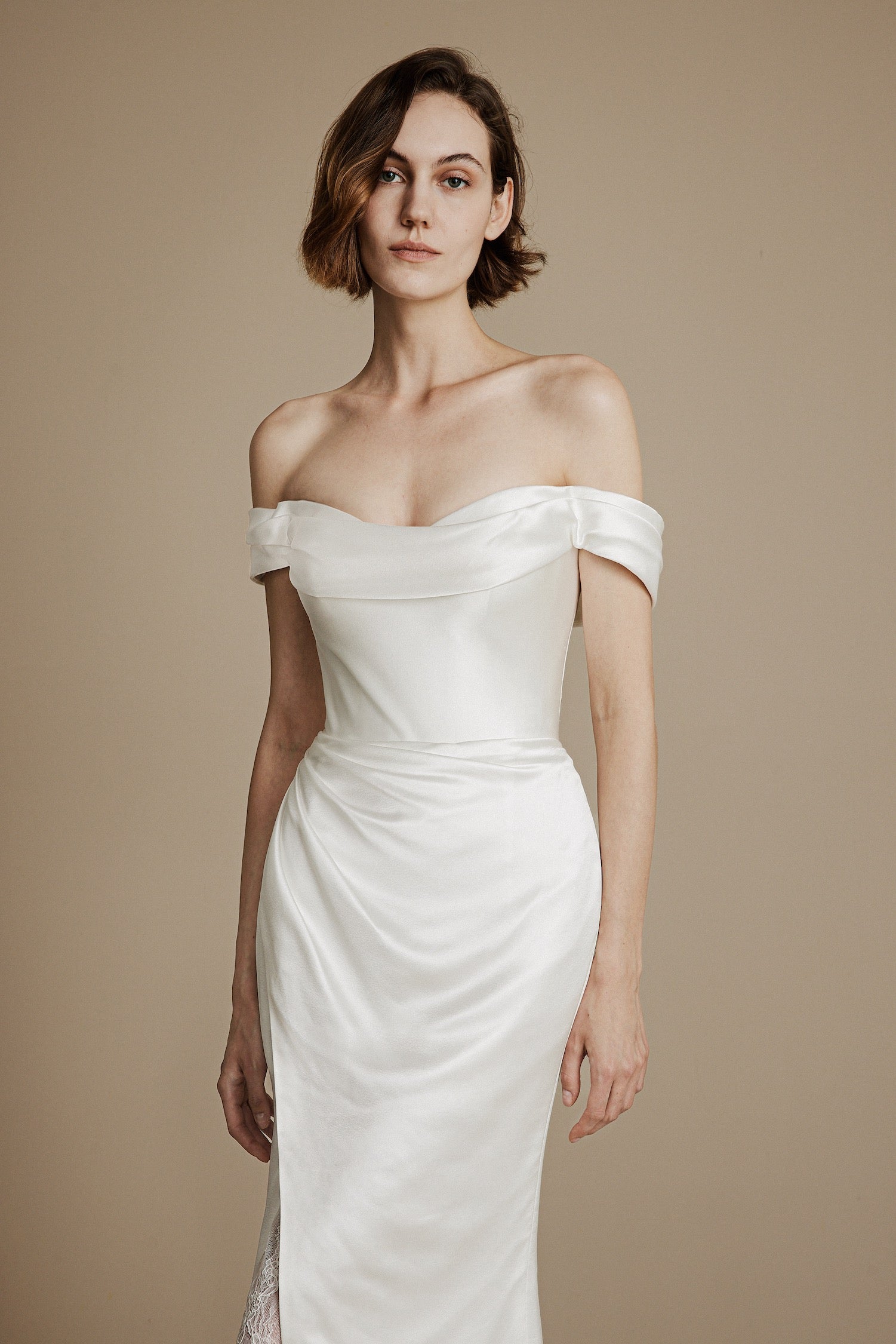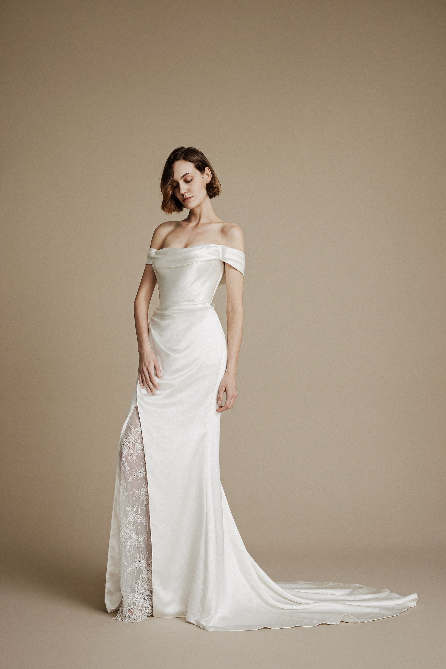 Carmen is cut from lustrous acetate satin that flows with ease. A sculpted neckline extends into off-the-shoulder sleeves, creating a streamlined one-piece bodice. Delicate draping and lace-panel slit details add subtle drama, giving the gown an elegant and fluid presence.