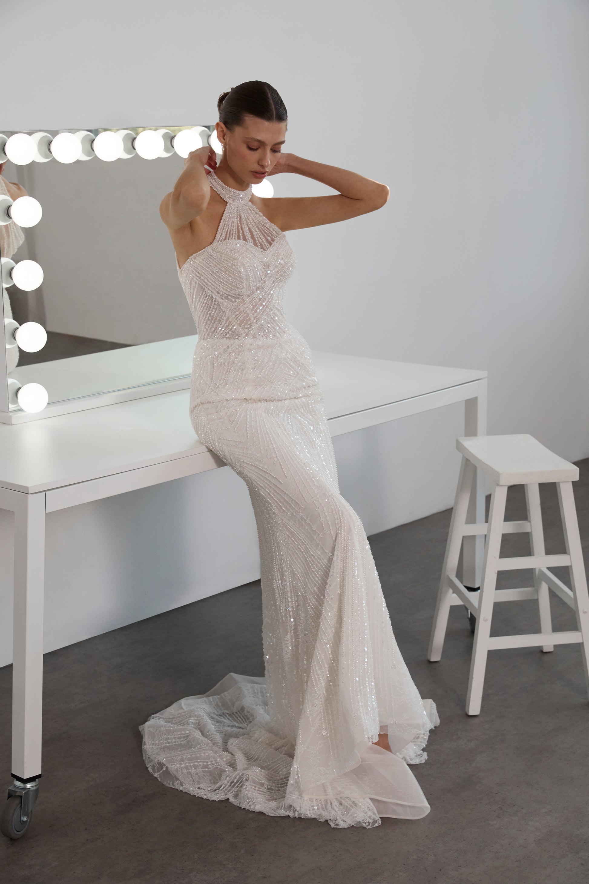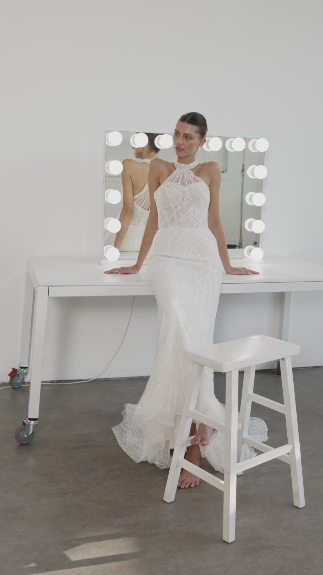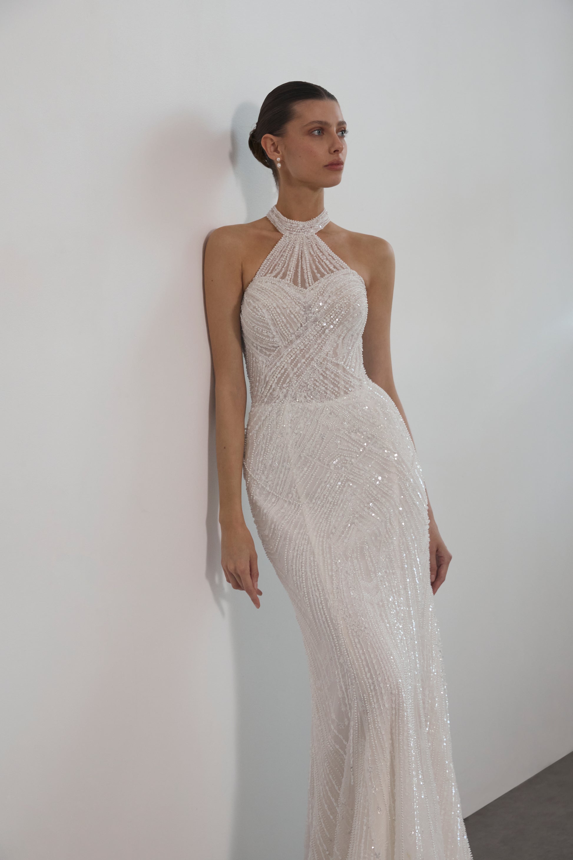 Hand-applied pearls provide rhythmic embellishment, and a detachable halter neckline adds modern versatility. Cerelia offers a balance of timeless glamour and contemporary adaptability, allowing each bride to shape her look with ease.