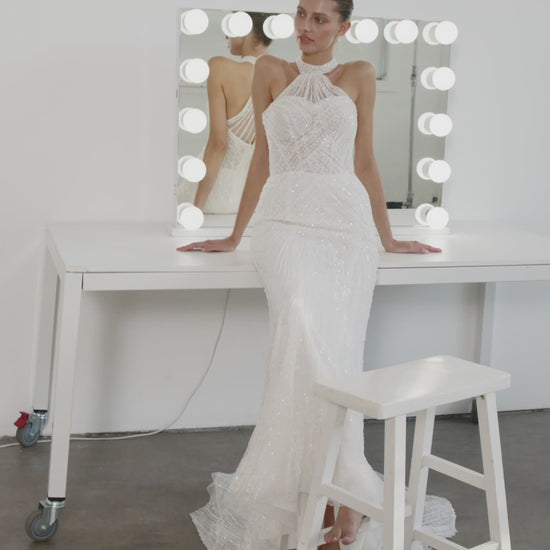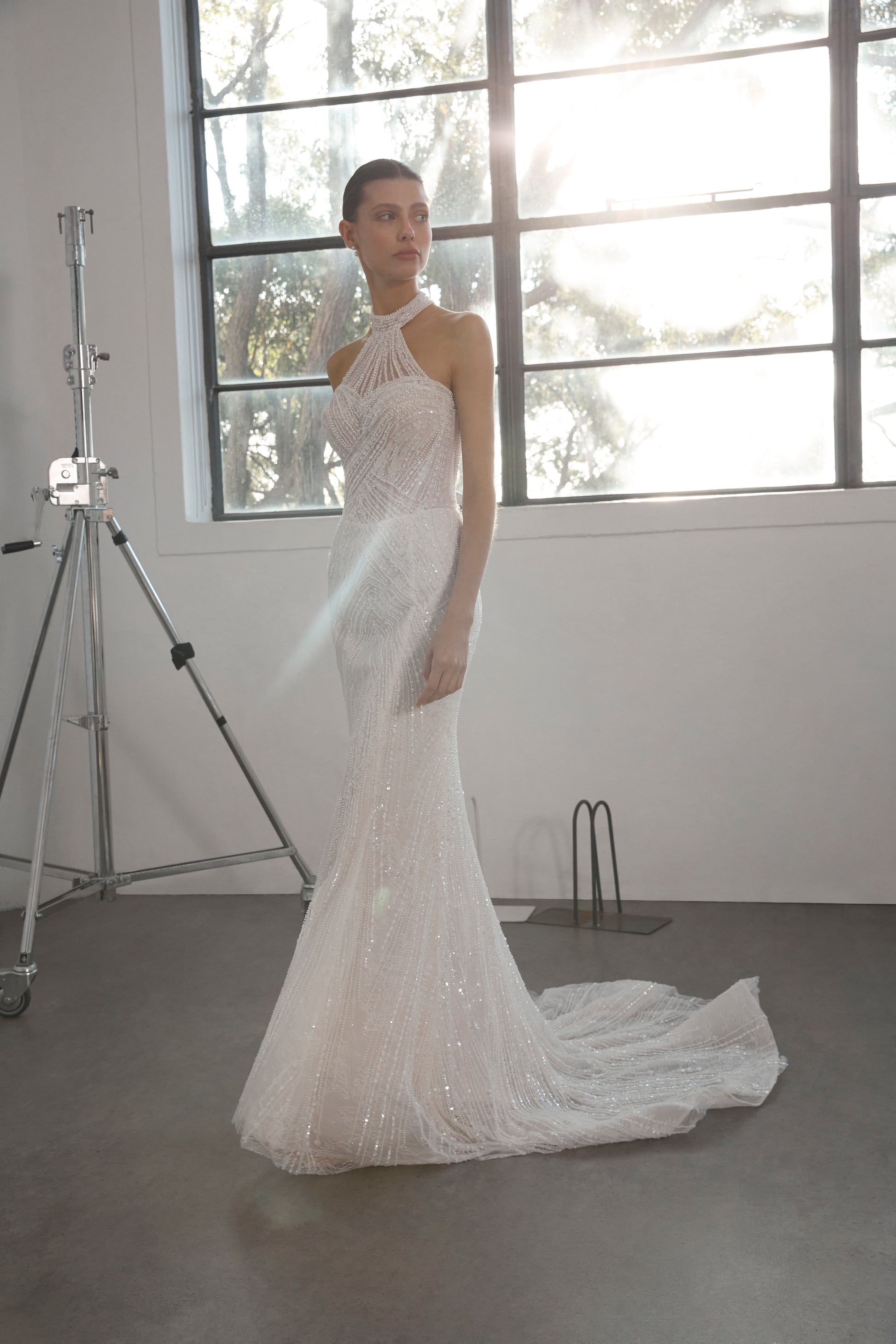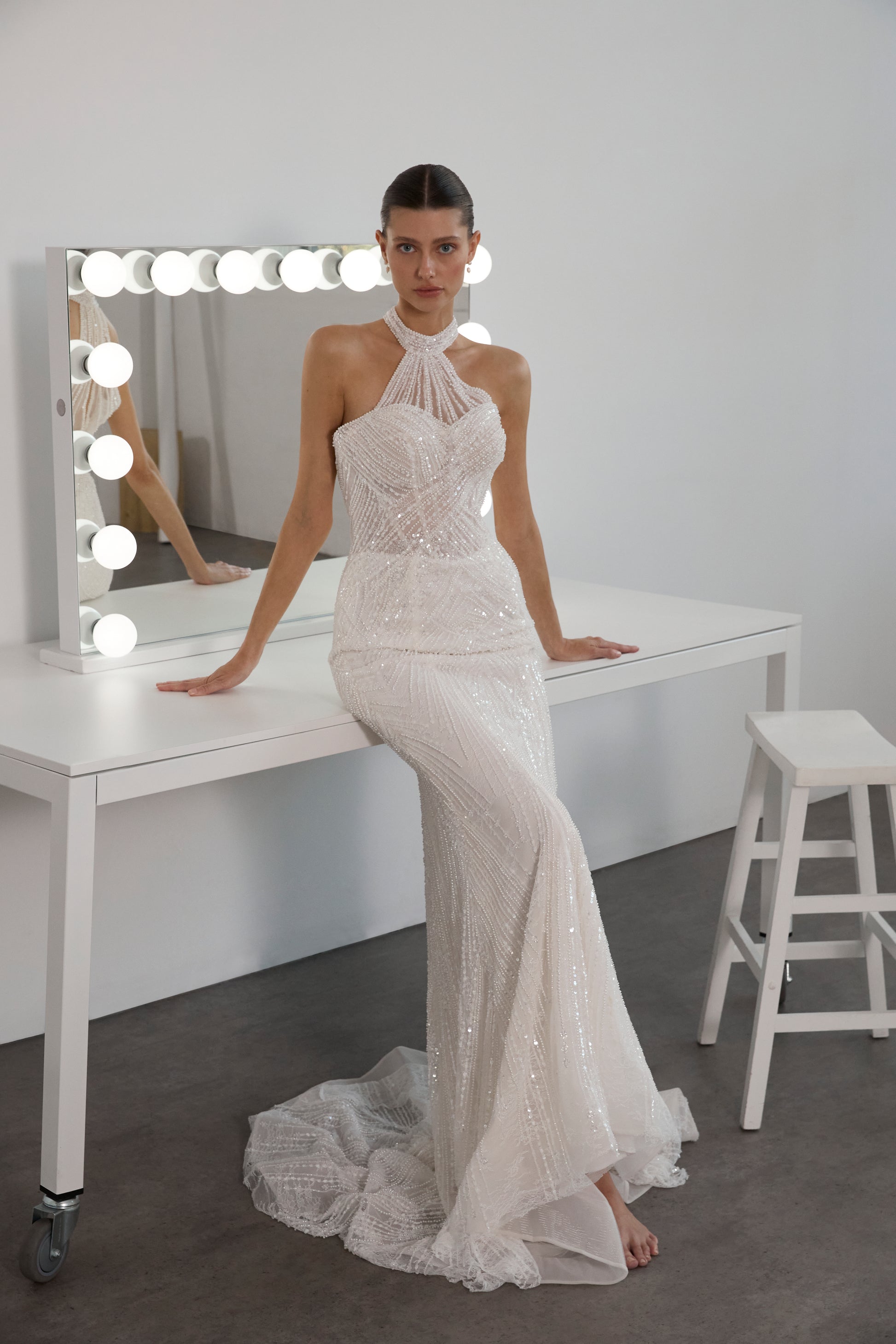 Hand-applied pearls provide rhythmic embellishment, and a detachable halter neckline adds modern versatility. Cerelia offers a balance of timeless glamour and contemporary adaptability, allowing each bride to shape her look with ease.