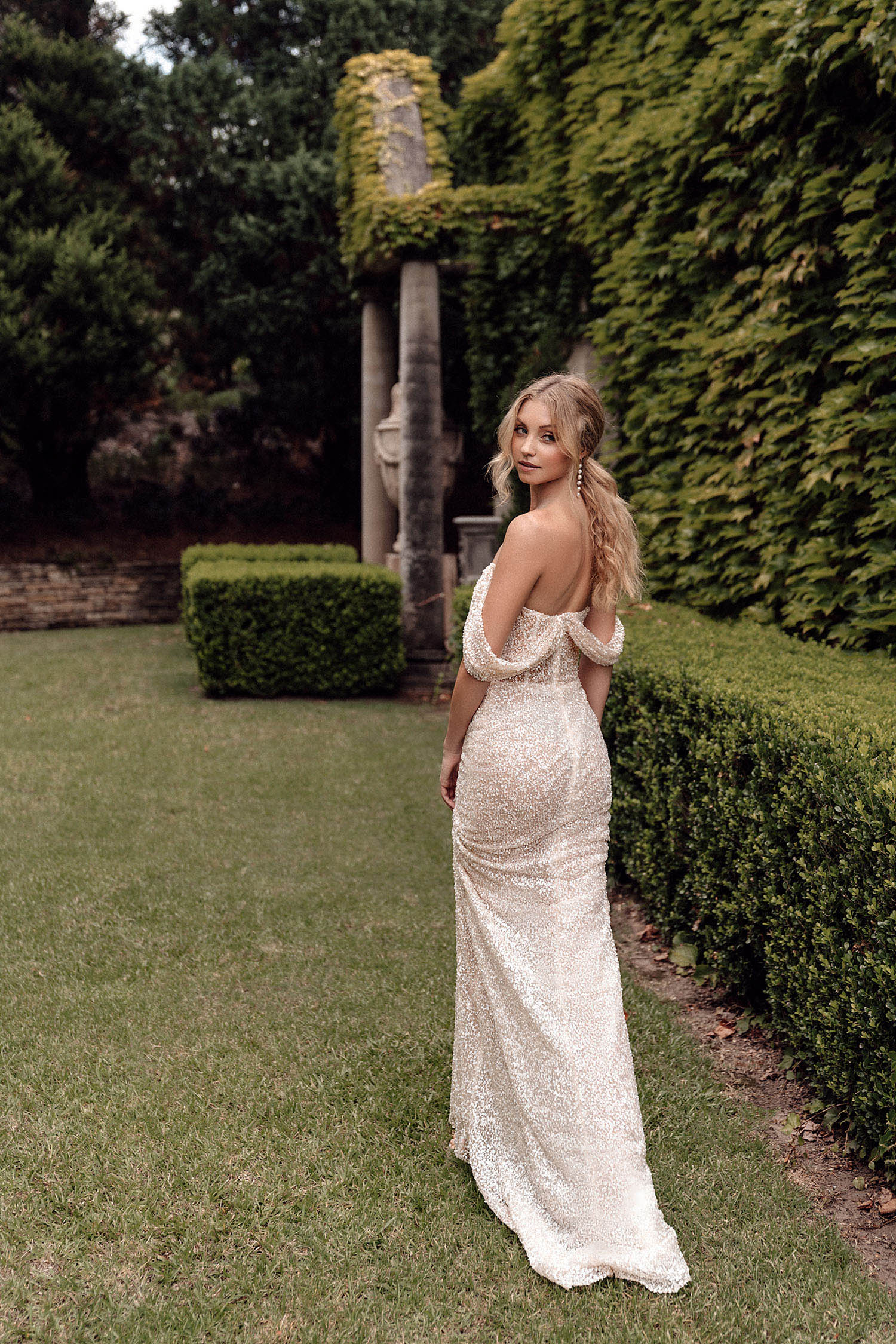Casablanca features a full-length sequined lace design with a boat-shaped neckline and a detachable off-shoulder detail. The dress includes exposed boning with diagonal lace pleats, culminating in a mermaid skirt.