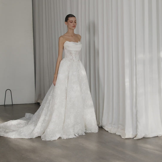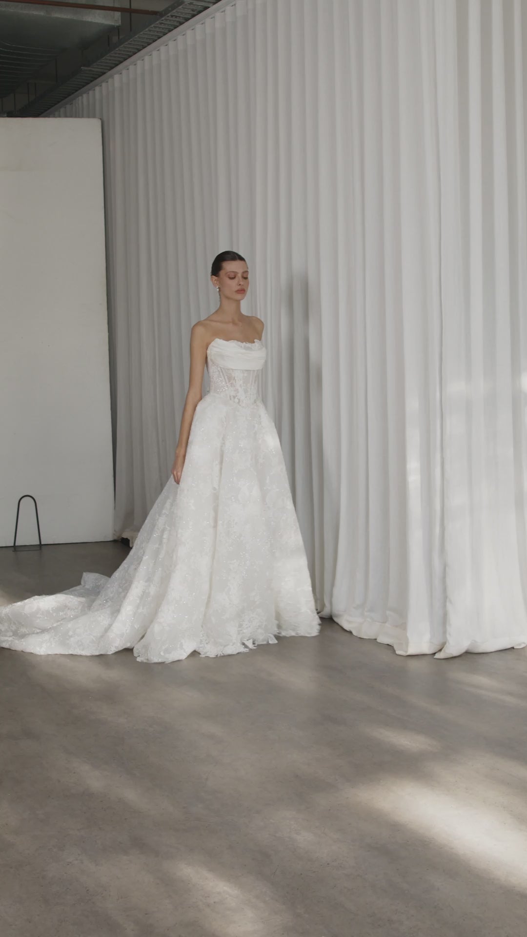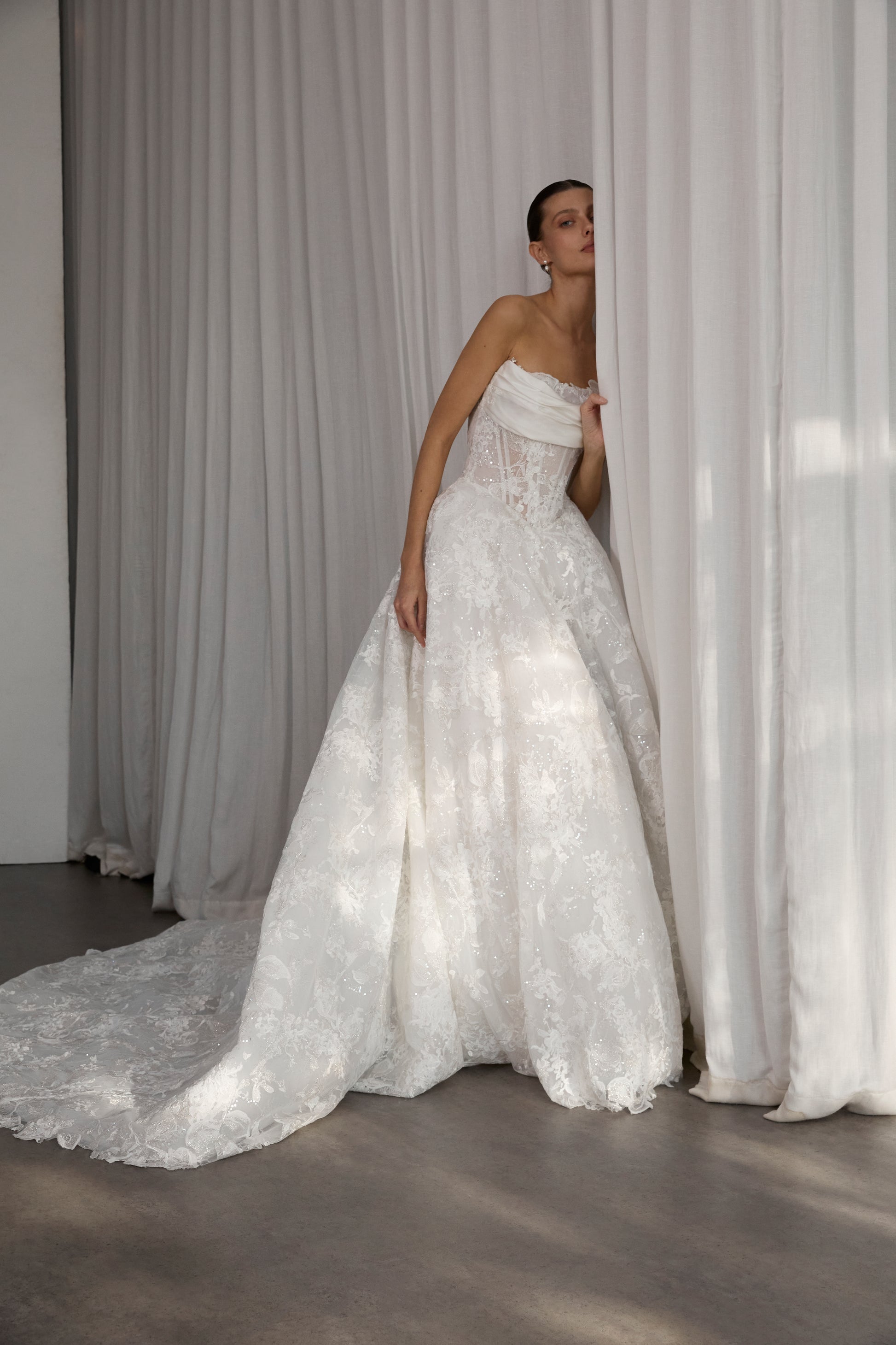 Clementine offers a glamorous take on the classic ballgown. Layered lace embroidery, executed with openwork carving techniques, lends lightness and intricacy. A dark satin bodice with fine pleating introduces modern contrast, while the full skirt maintains airy volume.
