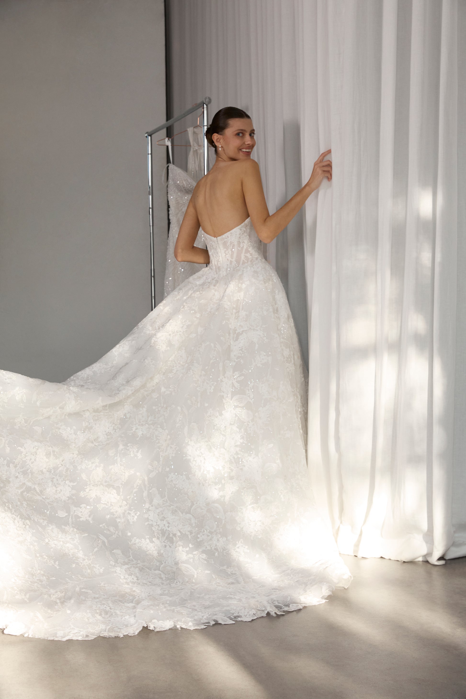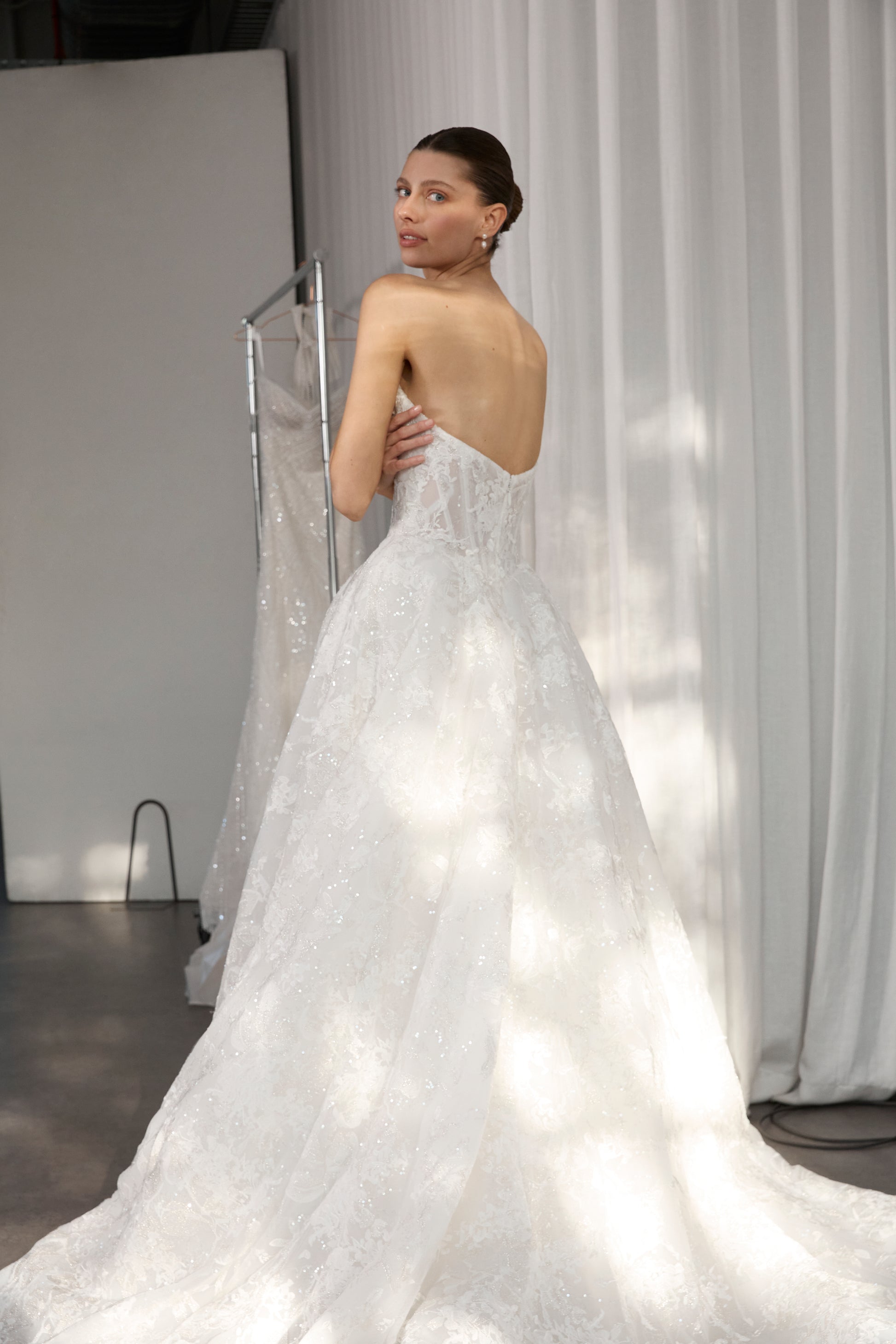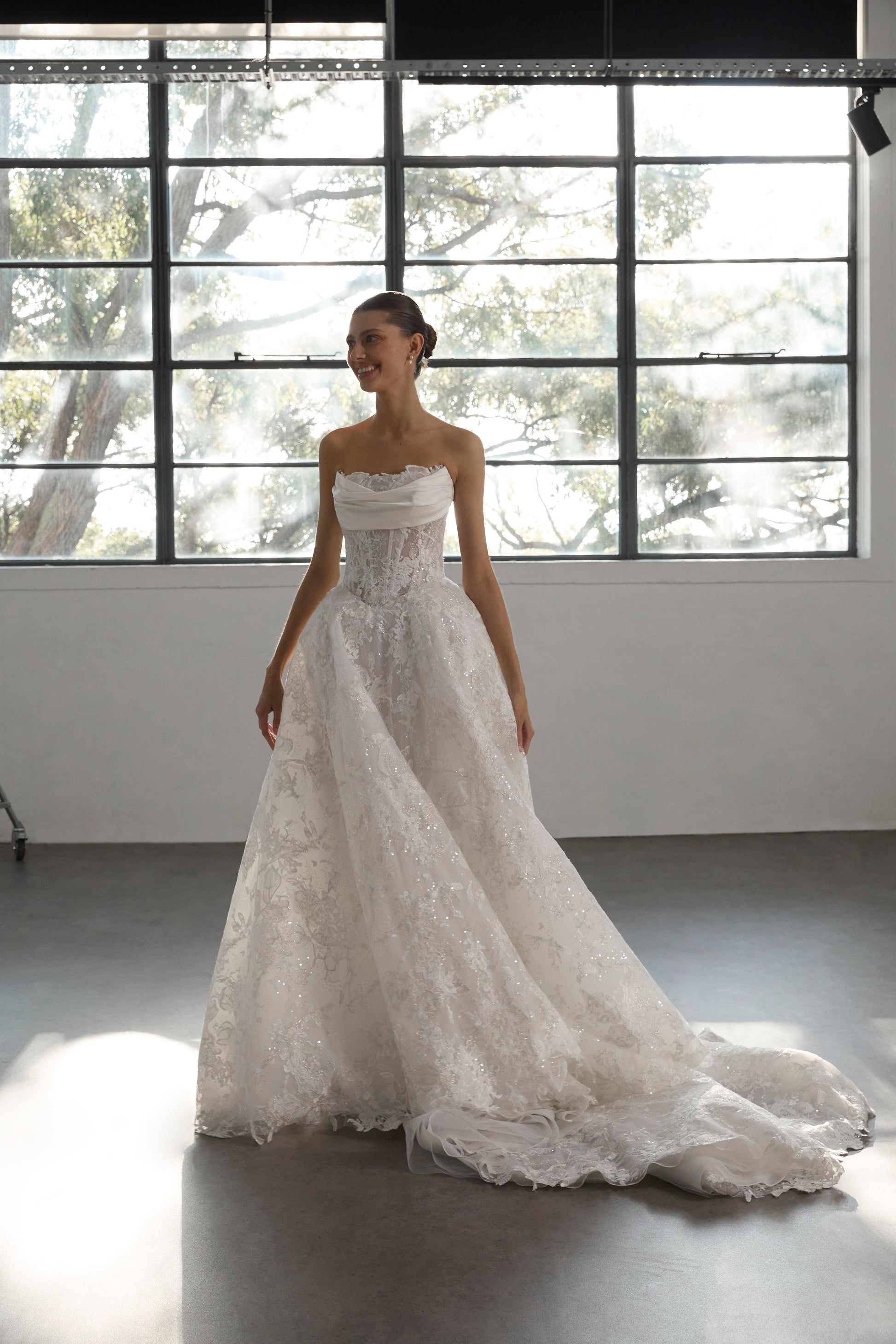 Clementine offers a glamorous take on the classic ballgown. Layered lace embroidery, executed with openwork carving techniques, lends lightness and intricacy. A dark satin bodice with fine pleating introduces modern contrast, while the full skirt maintains airy volume.