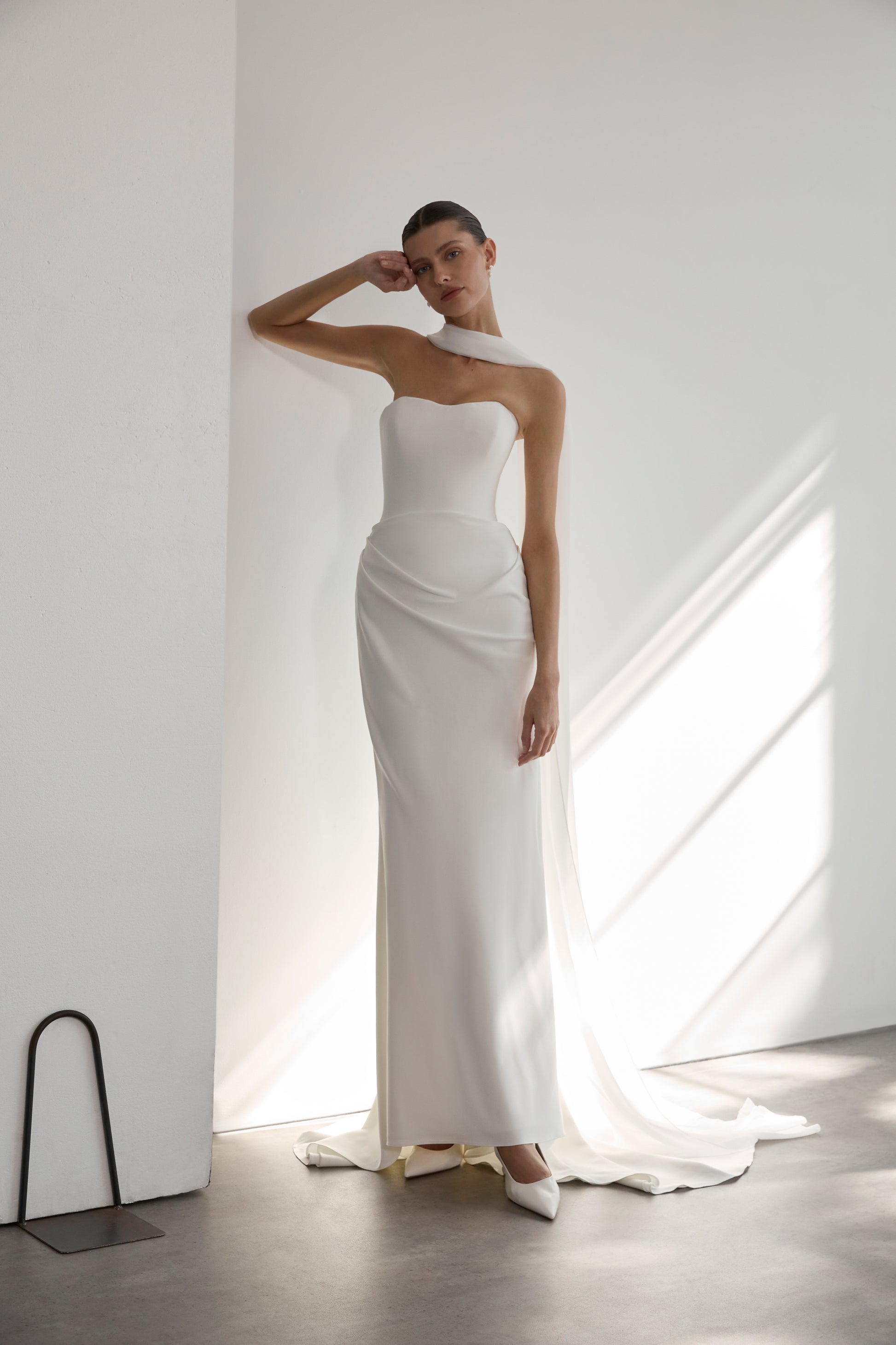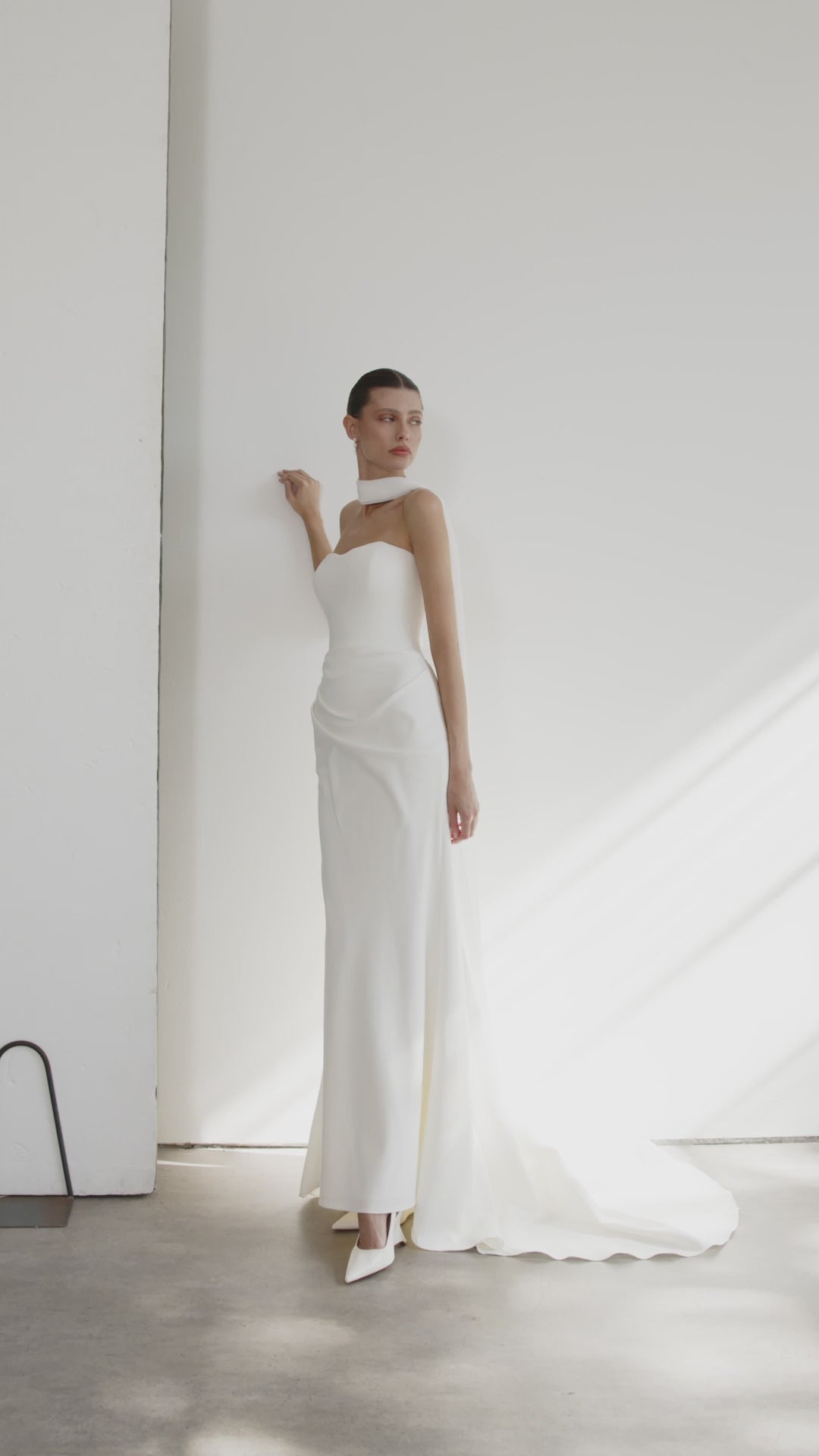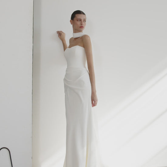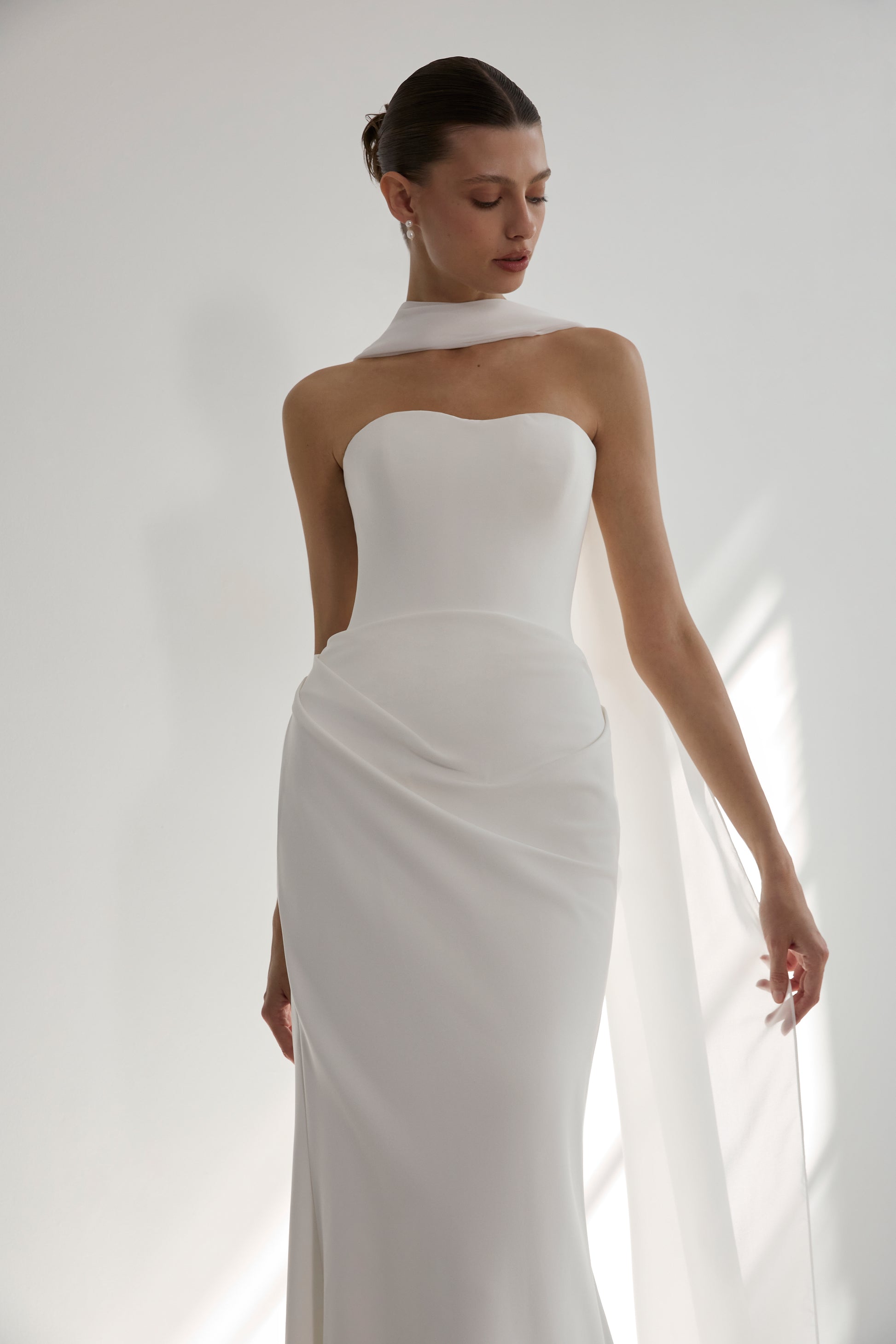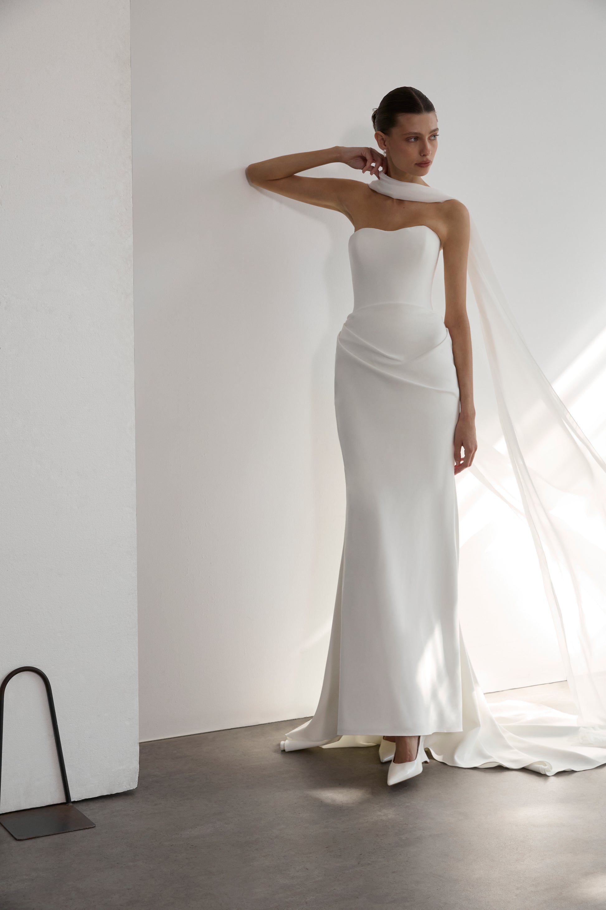 Cirrus embraces a minimalist aesthetic with matte satin and a softly curved neckline. A double-layered bodice ensures a smooth fit, while the skirt features bias-cut pleating for natural movement. Exceptional stretch creates a silhouette that follows every contour, combining comfort with elegance.