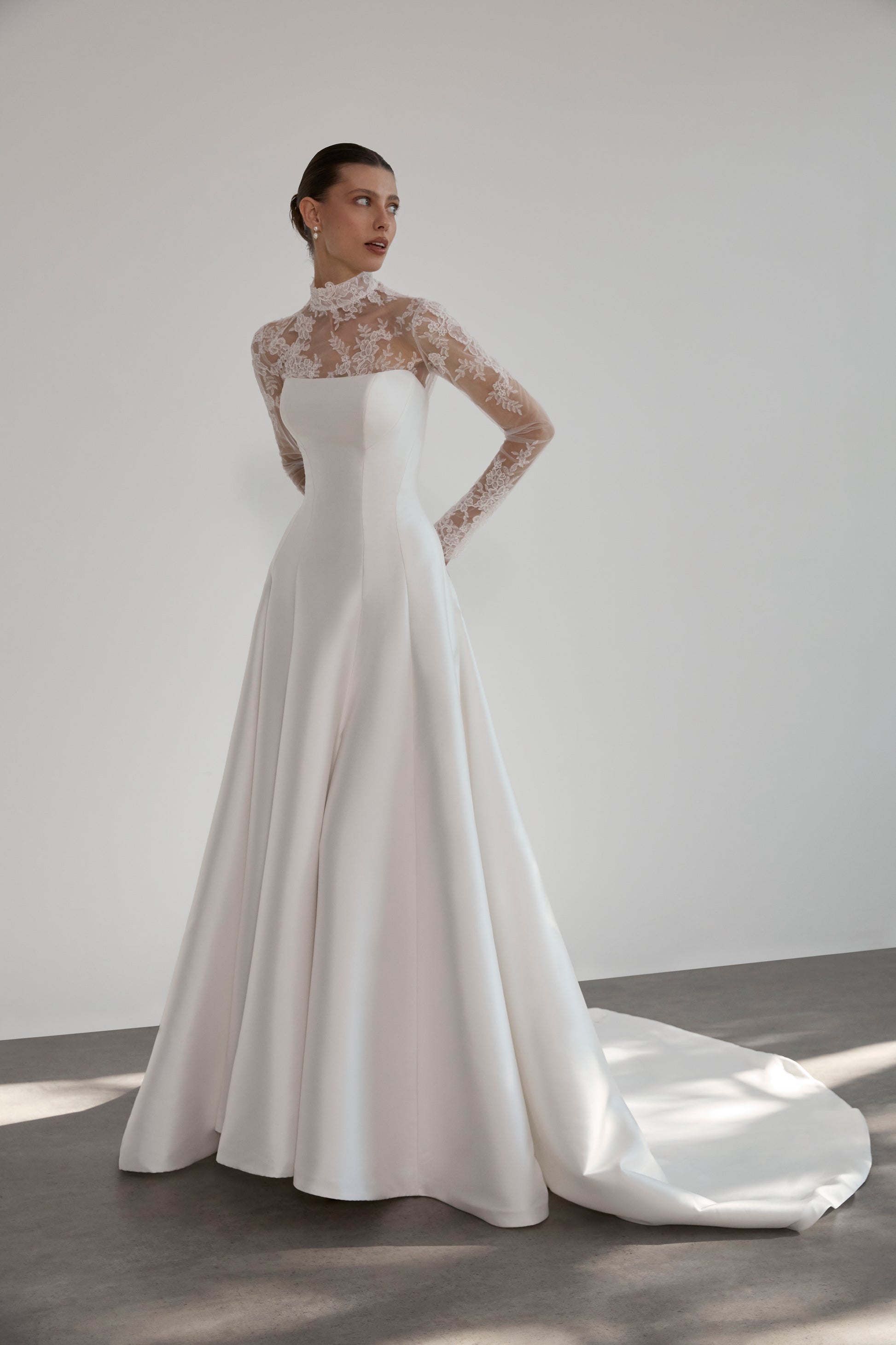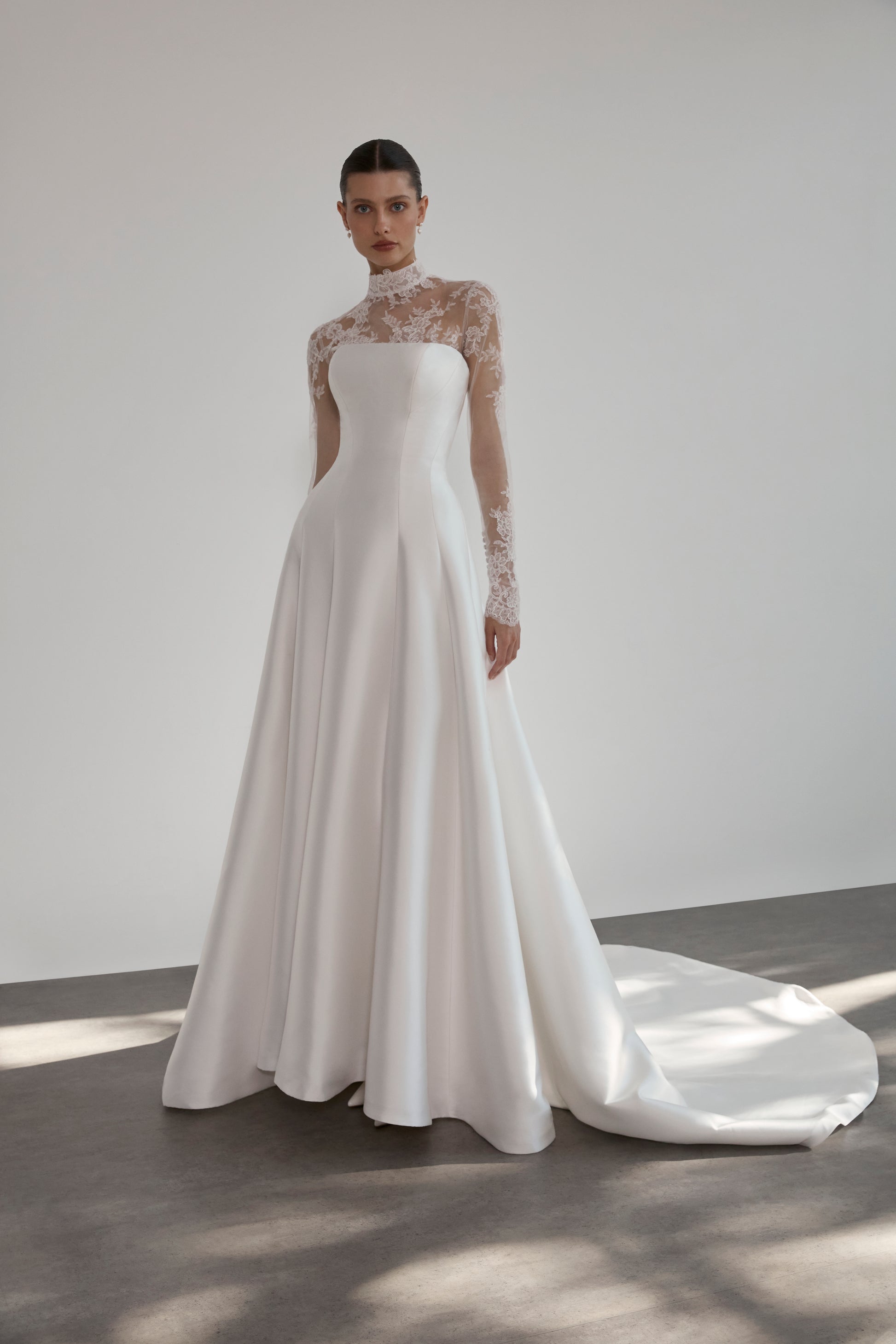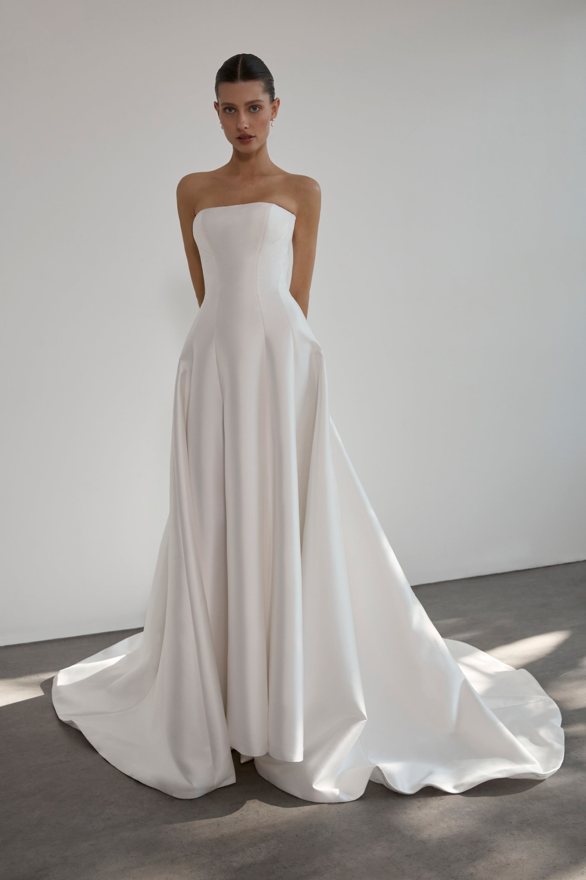 Constance embodies classic modernity with clean tailoring inspired by the jumpsuit. Structured Mikado shapes a sculpted skirt that feels timeless and weightless. A U-shaped neckline and precise chest seams enhance form and proportion, while full-length covered buttons bring a touch of regal sophistication. Every detail is designed for the bride who values refined style with couture sensibility.