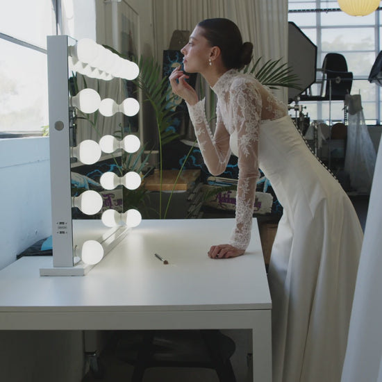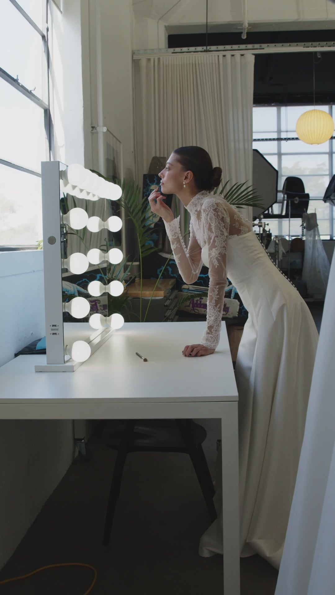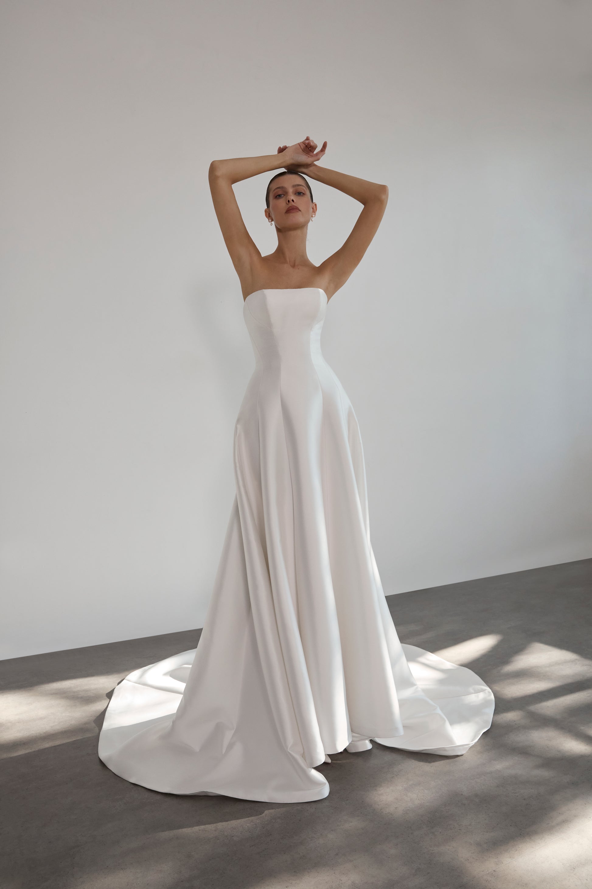 Constance embodies classic modernity with clean tailoring inspired by the jumpsuit. Structured Mikado shapes a sculpted skirt that feels timeless and weightless. A U-shaped neckline and precise chest seams enhance form and proportion, while full-length covered buttons bring a touch of regal sophistication. Every detail is designed for the bride who values refined style with couture sensibility.