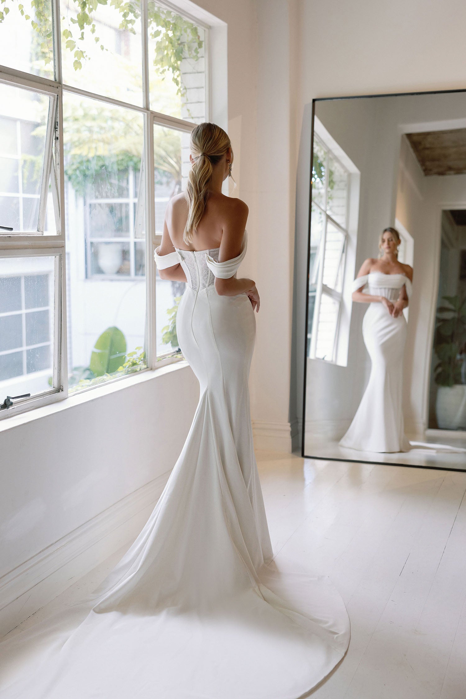The Eva gown beautifully combines satin and French lace, offering a distinctive twist on contemporary satin styles. Crafted from luxurious crepe fabric, which is a favorite among our bestsellers, this gown showcases a refined elegance that is both timeless and modern. The harmonious blend of textures and materials creates a stunning silhouette, making Eva a captivating choice for brides who seek a unique and sophisticated look on their special day.