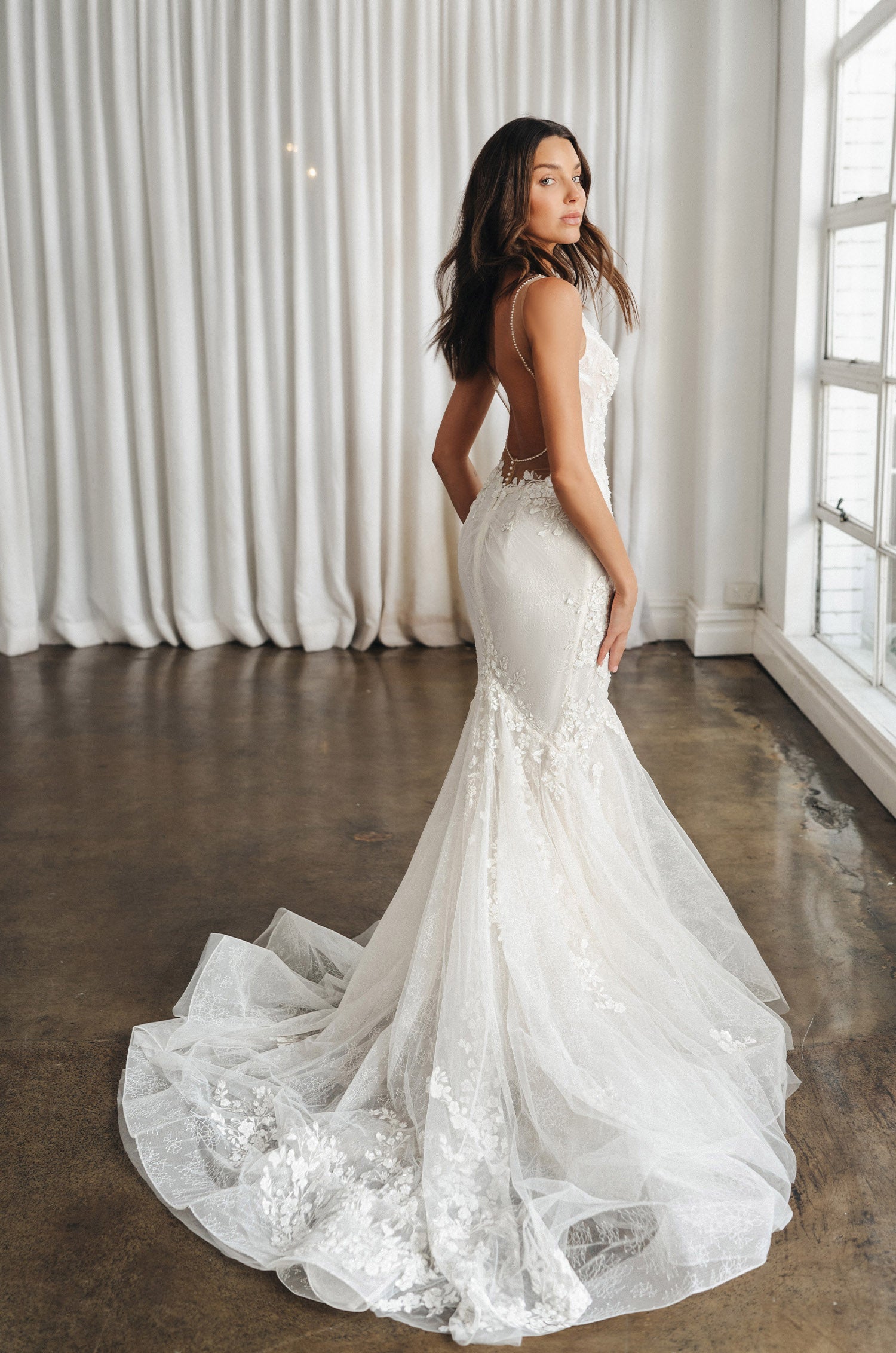 Extraordinary is a deep V-neck mermaid dress adorned with delicate beading on the bodice. Its exquisite back design and pleats at the hips beautifully enhance the body shape, creating a stunning silhouette.