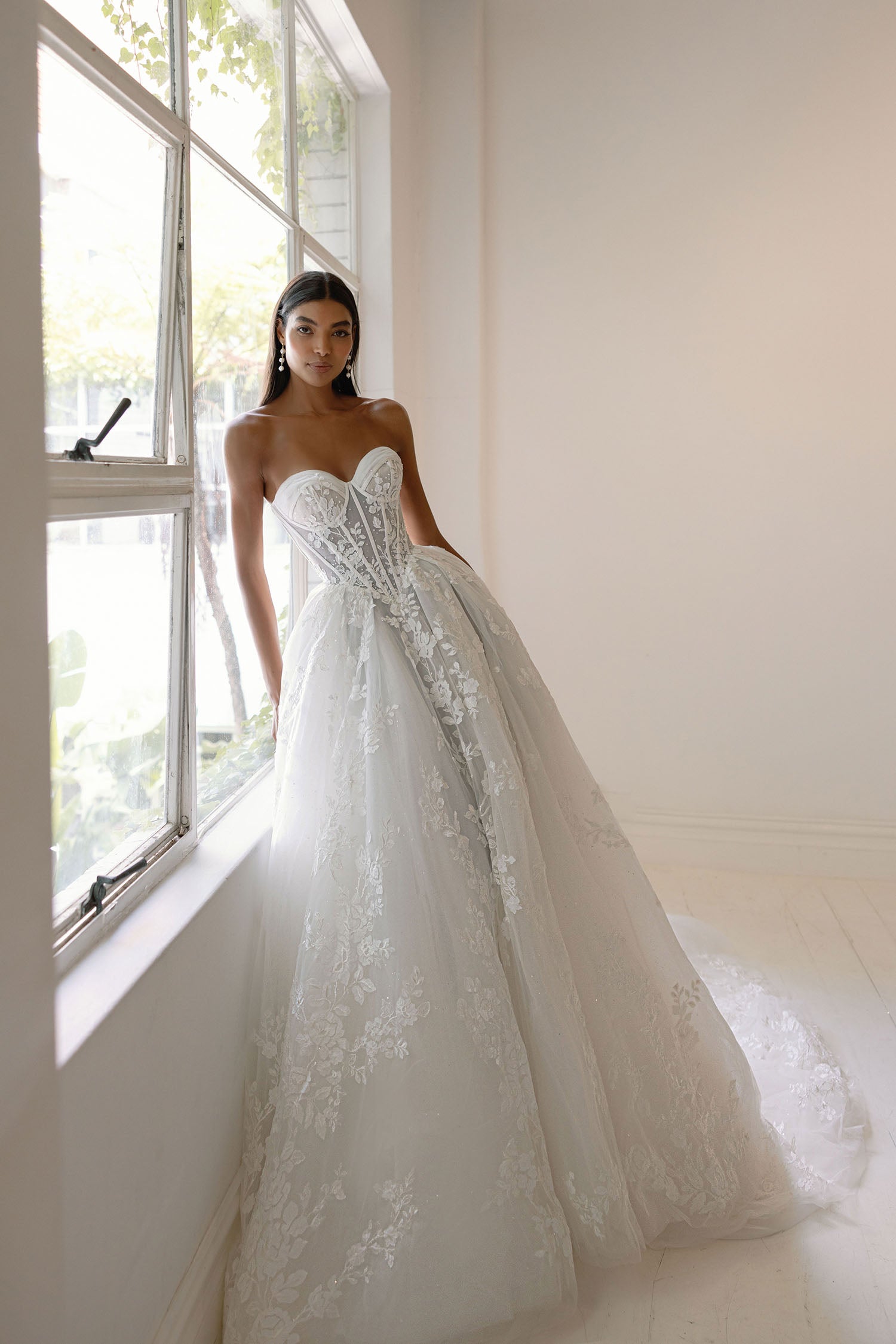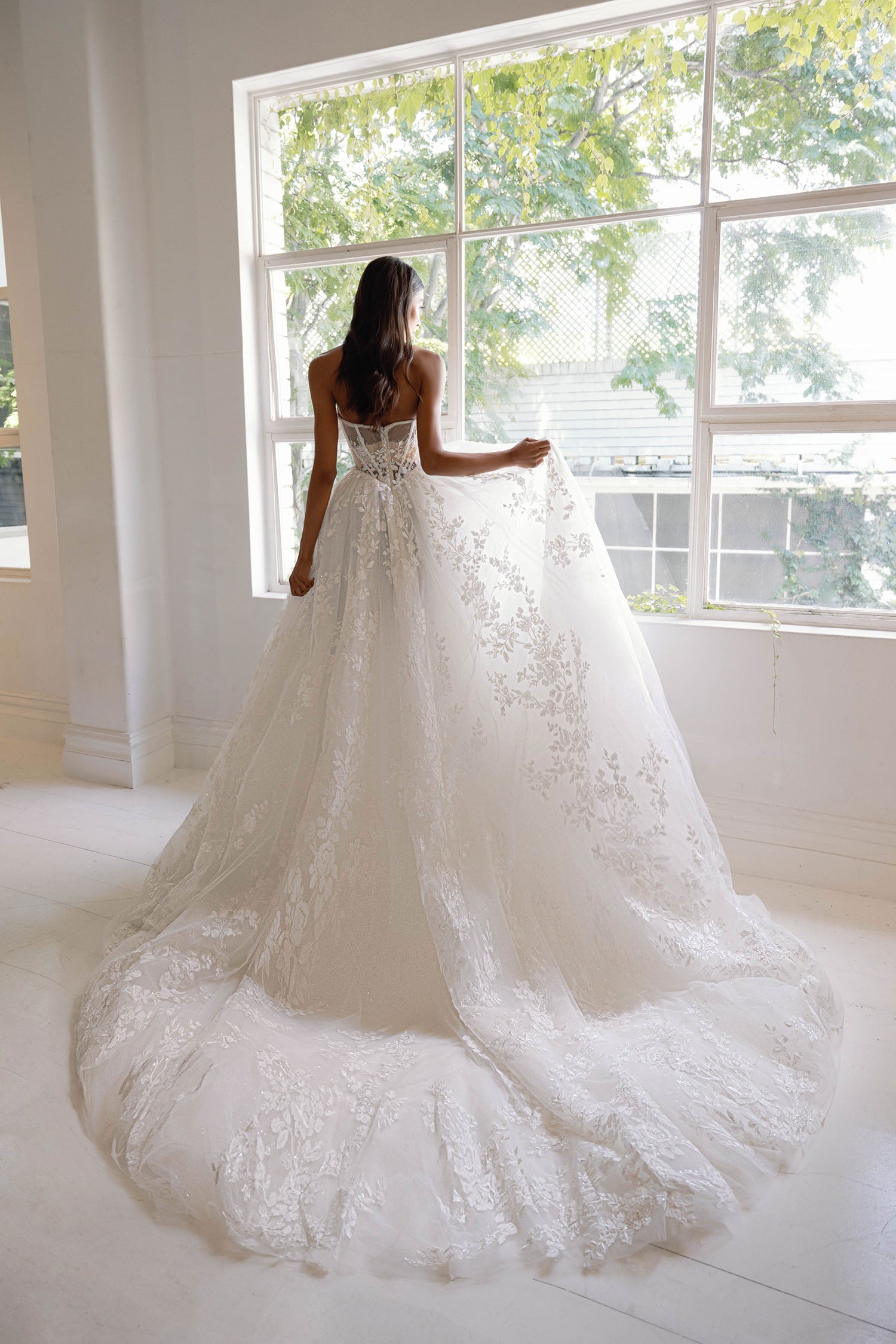 The Greta Gown showcases a flattering A-line silhouette with a basque waistline, a highly sought-after design. Adorned with delicate beads and mesh pleats on the bodice, it features intricately crafted laser-cut lace flowers that add a touch of romance to the overall look. This gown beautifully combines elegance and trendiness, making it an ideal choice for Modern Bride: modernbrideaz.coms.