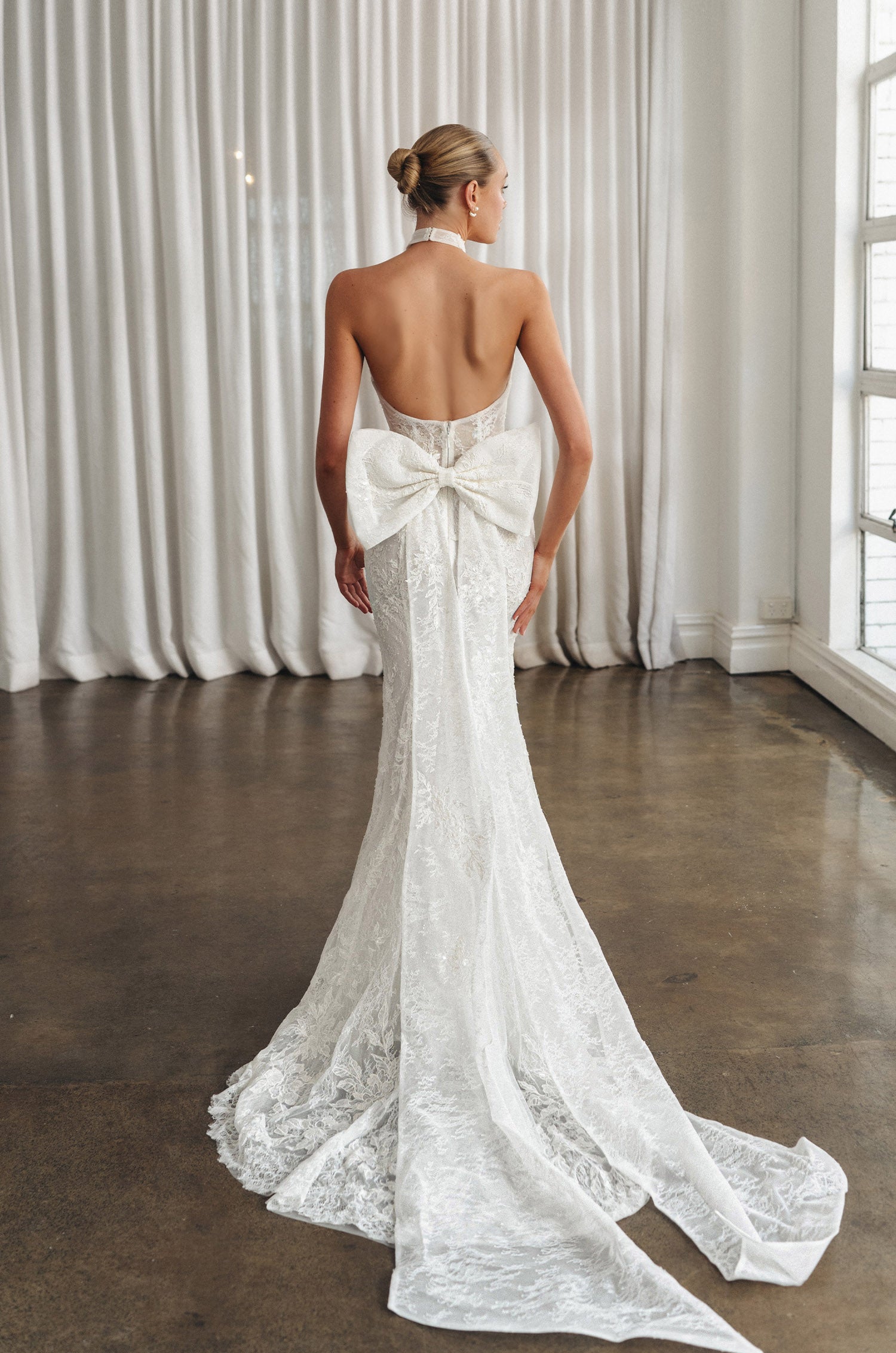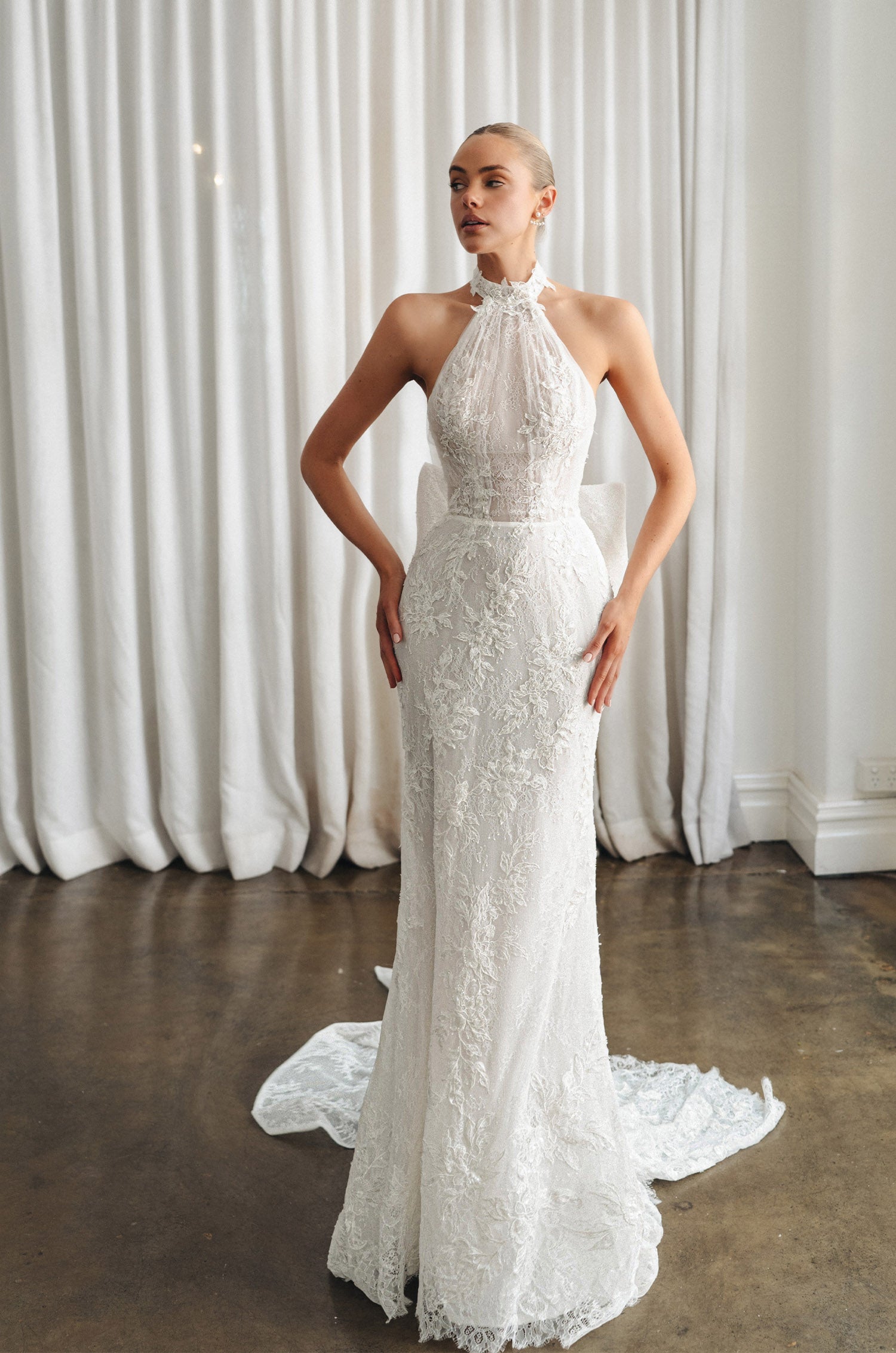 Ideal features a trendy structure with a unique combination of flat lace and embroidered lace. The bodice includes pleats that enhance the bride's figure, adding a touch of elegance to the overall design.