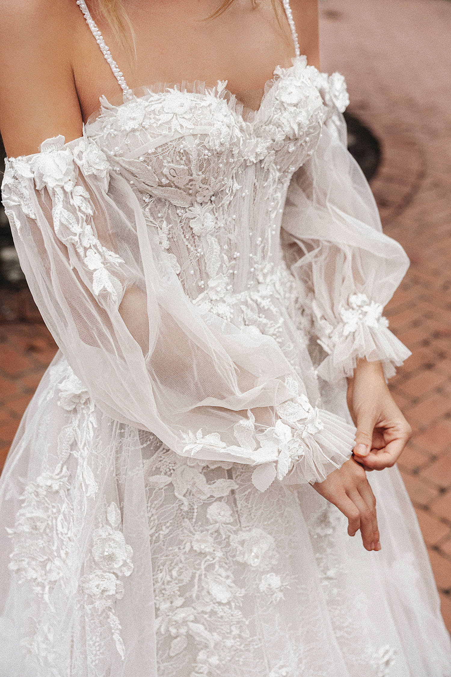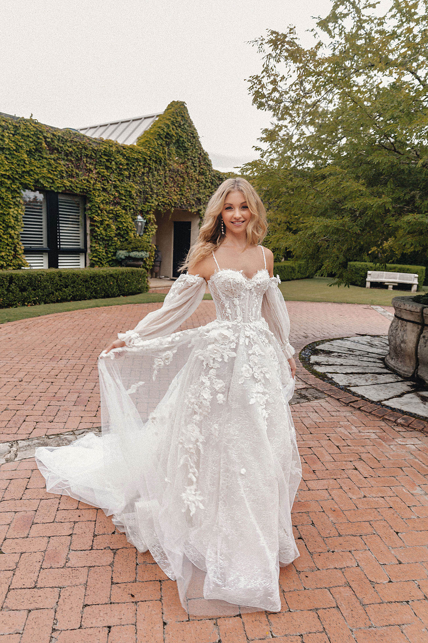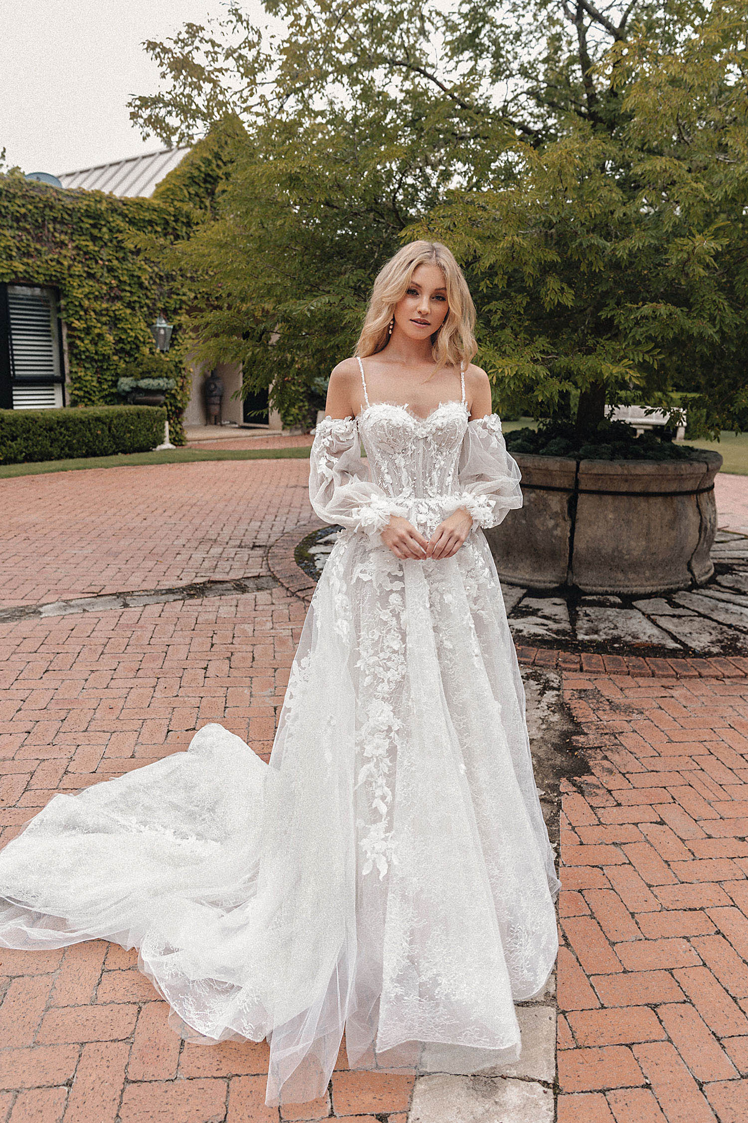 Istanbul is the best-selling dress in this collection. This spaghetti strap A-line gown is light and slightly transparent, featuring a long train. The detachable sleeves offer versatility, making it suitable for brides with varying preferences.