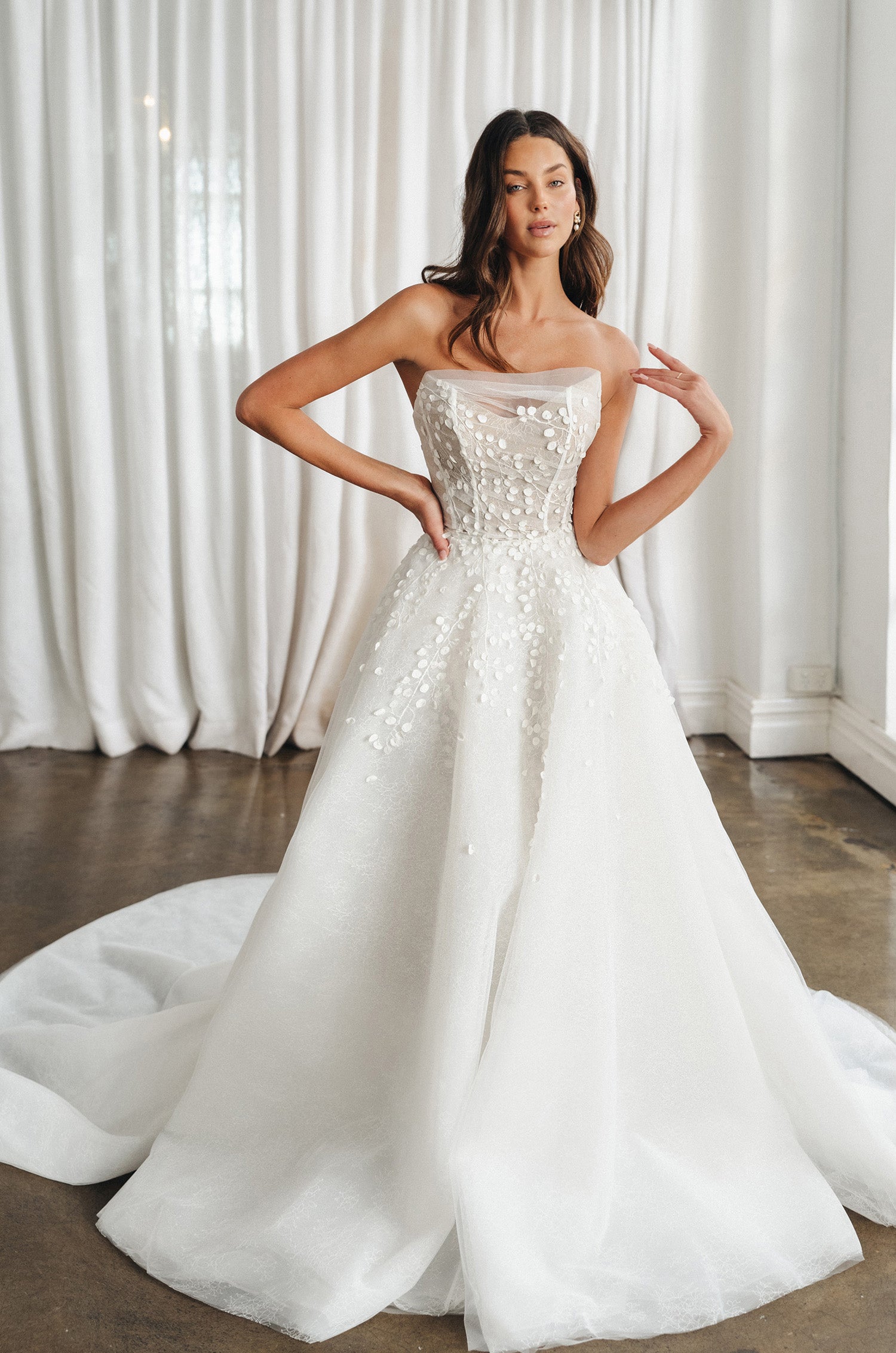 The Jade skirt features a distinctive design characterized by its pleated silhouette, with lace applications seamlessly integrated along the pleats. This mermaid-style skirt beautifully accentuates the body's curves. When paired with the detachable overskirt, it transforms into an elegant A-line dress, making it versatile for various occasions.