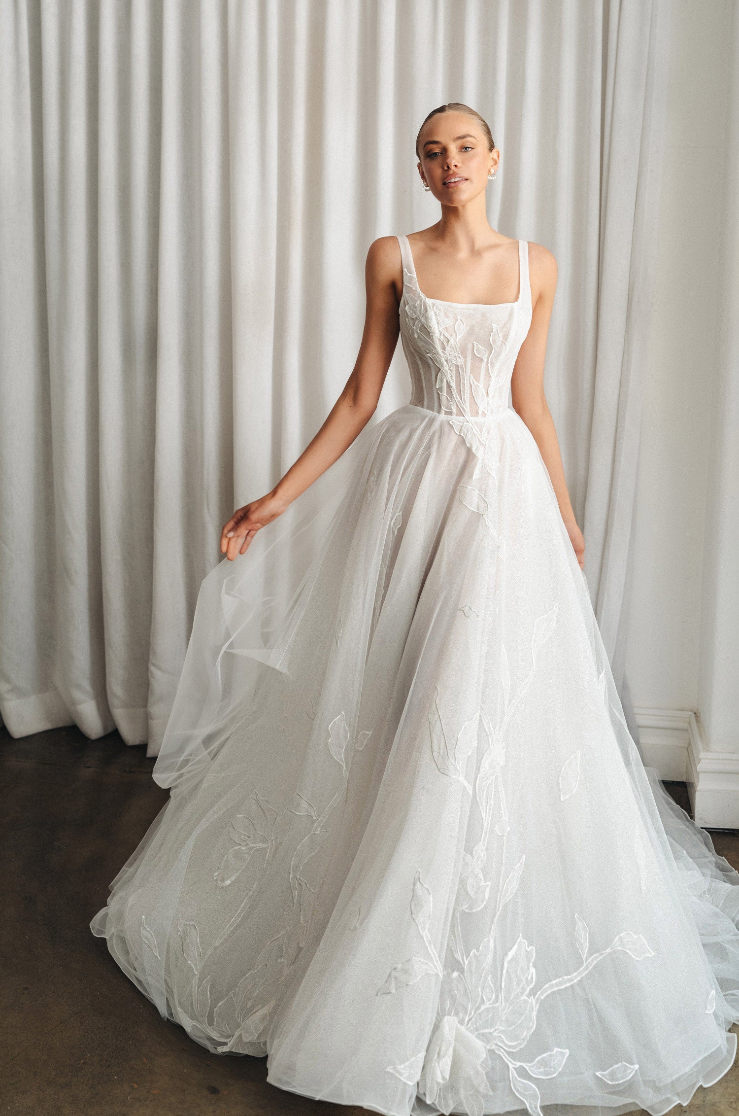 Kayla features a light and romantic A-line silhouette with a spaghetti strap square neckline. The unique appliqués on the gown challenge traditional designs, adding a distinctive touch to this elegant piece.