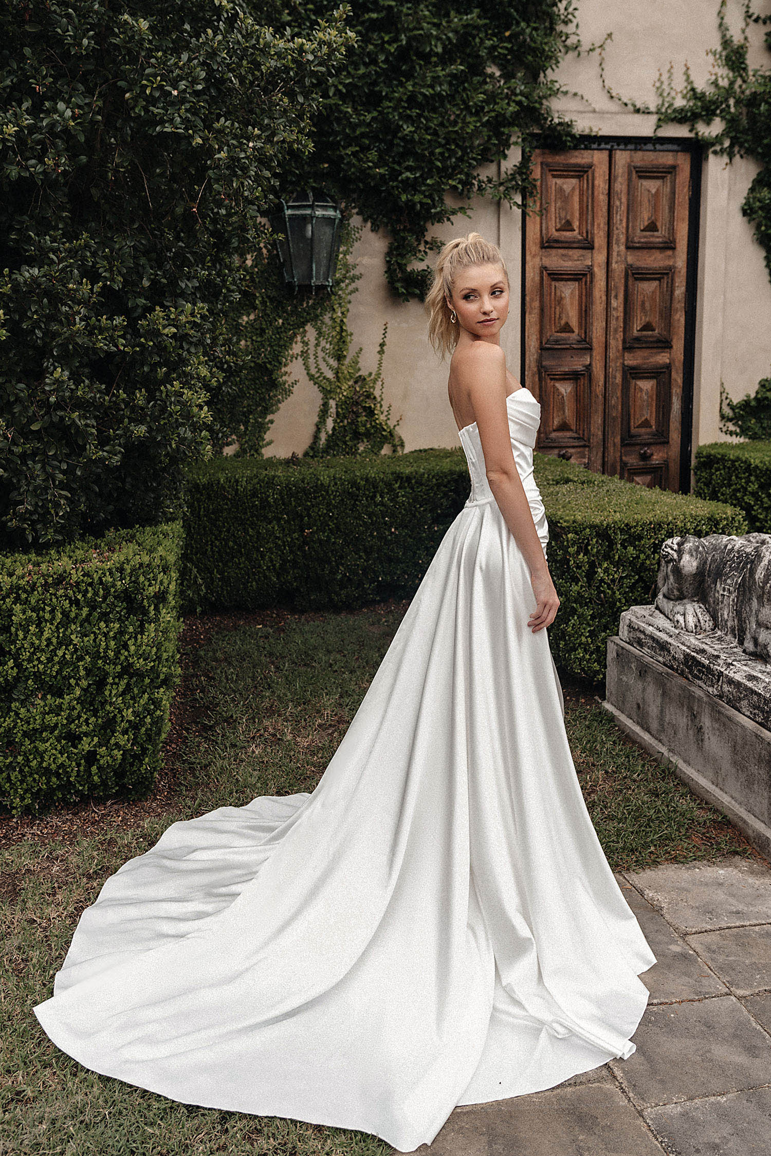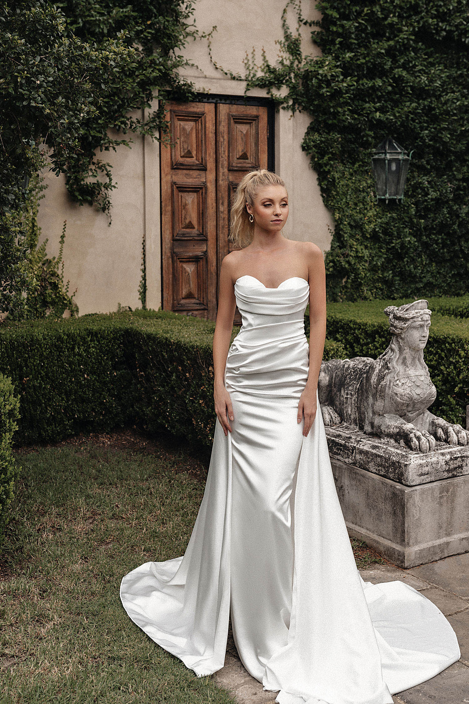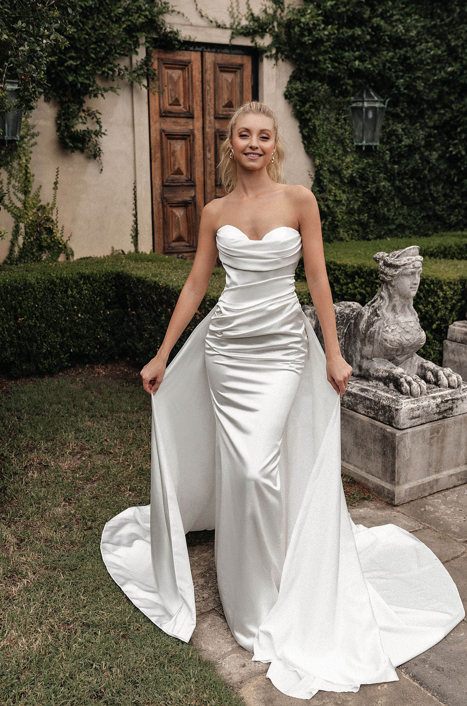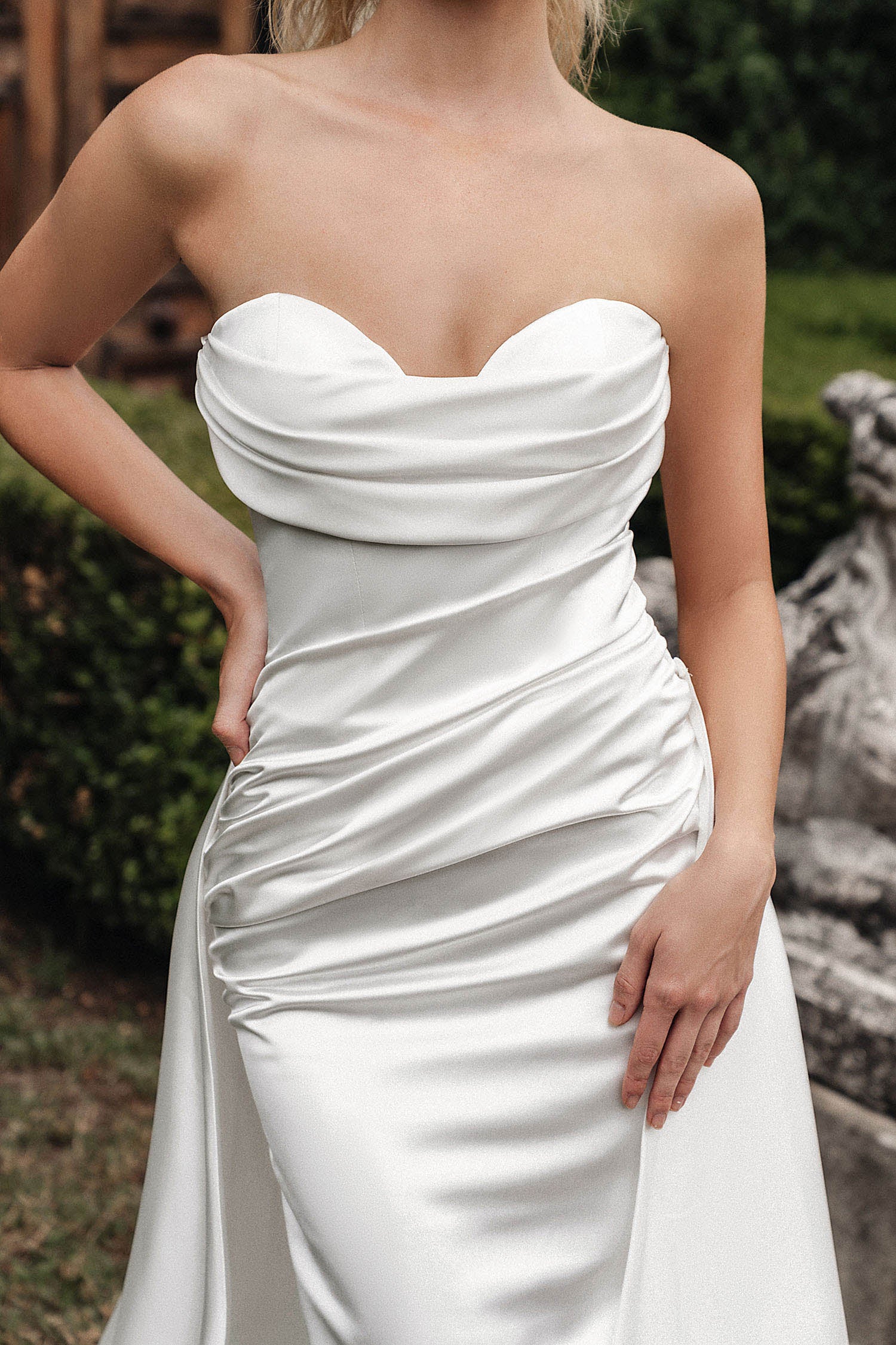 London is a strapless satin mermaid dress featuring pleats at the bust and hips, complemented by a satin overskirt that enhances the train's volume.