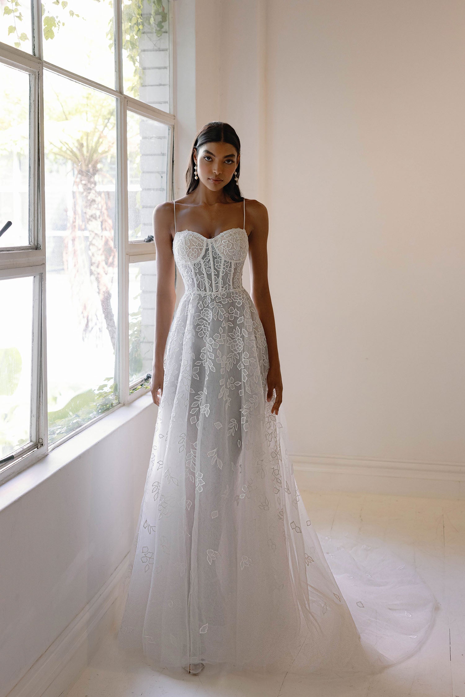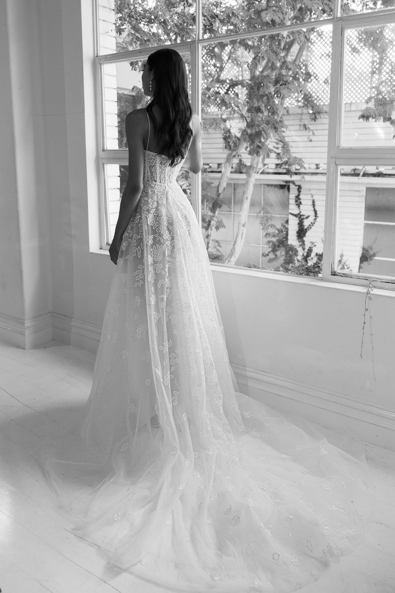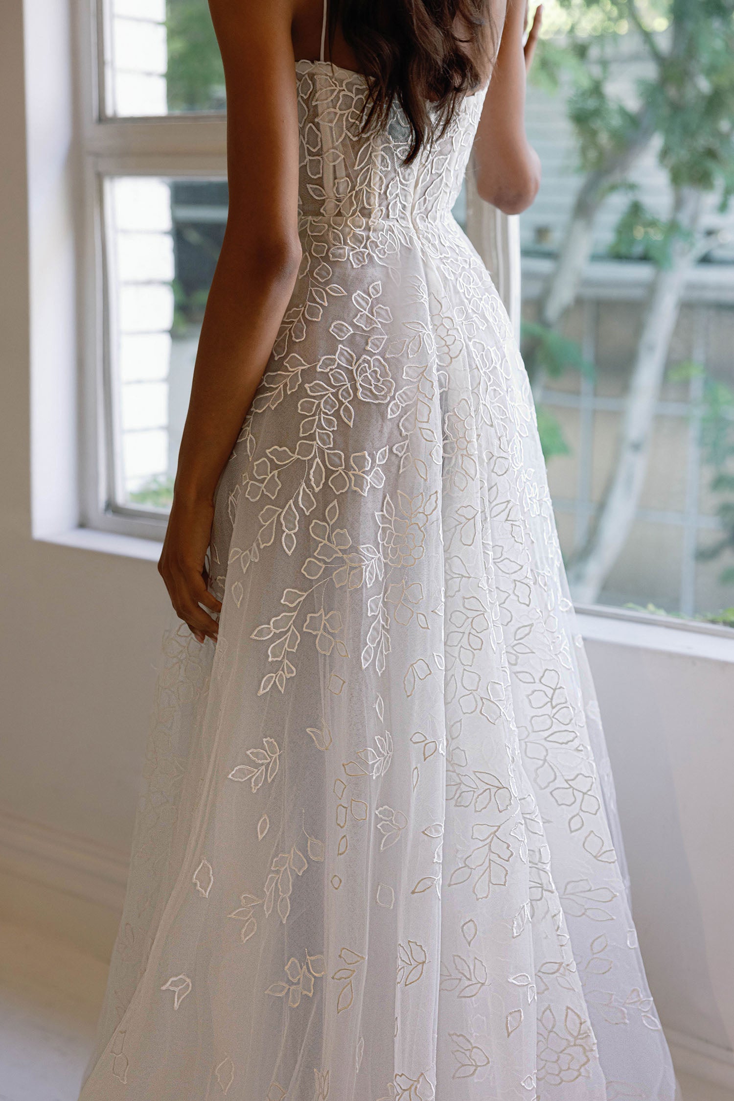 The Lonne gown is crafted from lightweight lace, featuring delicate spaghetti straps and a soft round tulle skirt. This enchanting design embodies a light and romantic aesthetic, making it a versatile choice for various occasions. Its airy silhouette ensures comfort while allowing brides to embrace their femininity with grace and charm. Whether for a wedding or a special event, Lonne captures the essence of effortless elegance.