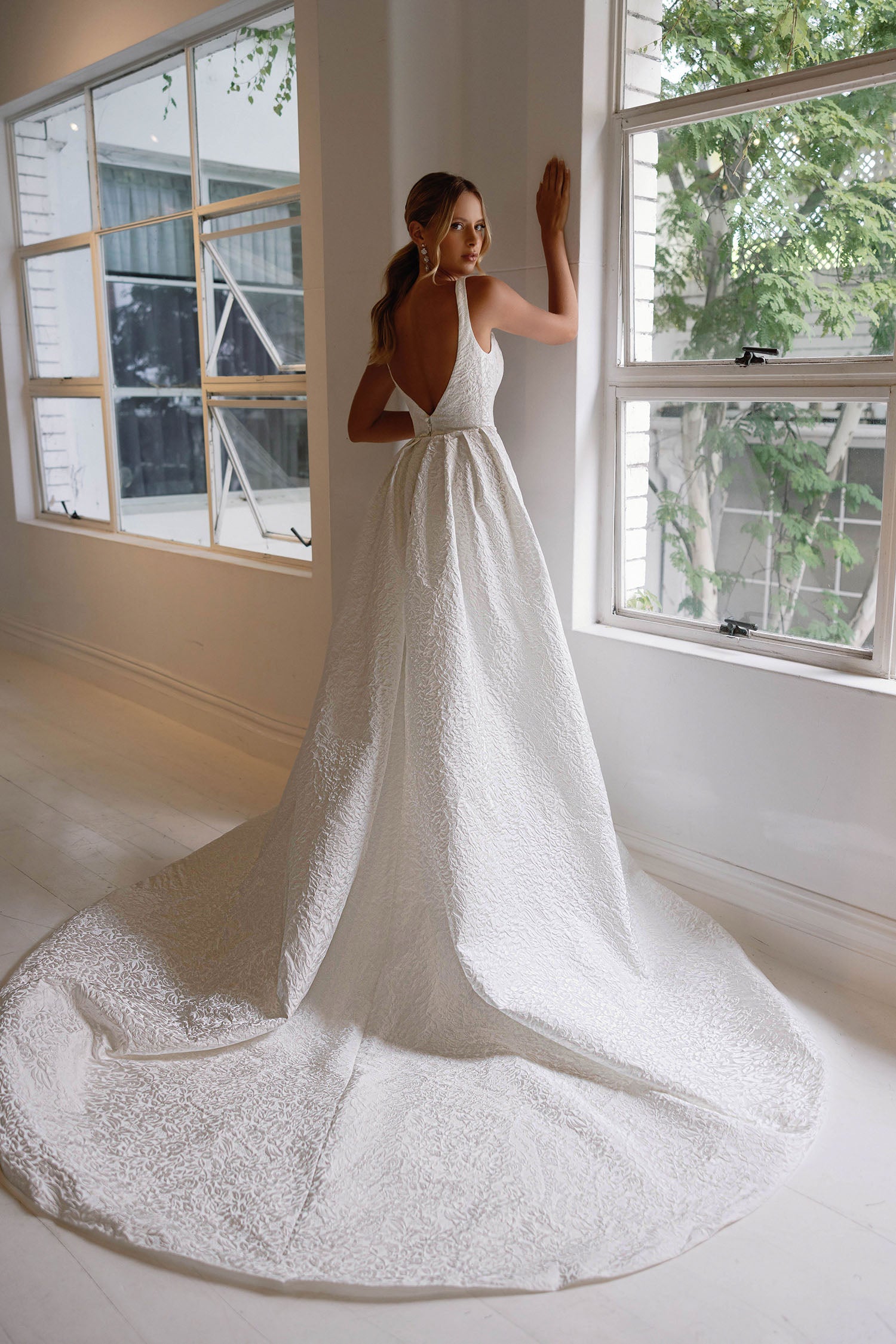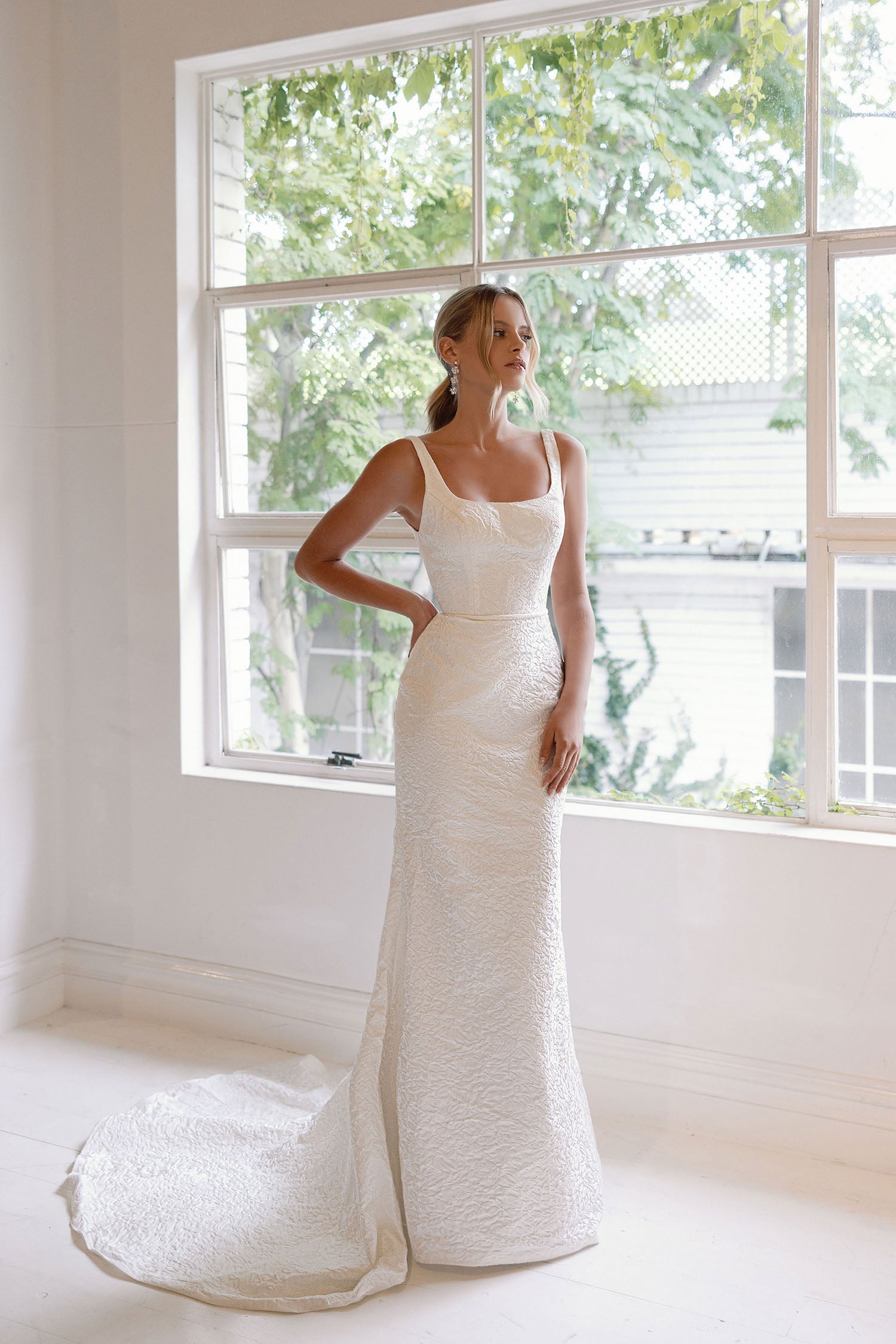 The MARINE gown features a striking square neckline and a flattering mermaid silhouette that beautifully accentuates the body's curves. A delicate thin belt can be added for an extra touch of elegance. Crafted from luxurious jacquard fabric, the design embodies simplicity while exuding a unique aura, making it an ideal choice for brides seeking a sophisticated yet understated look on their special day.